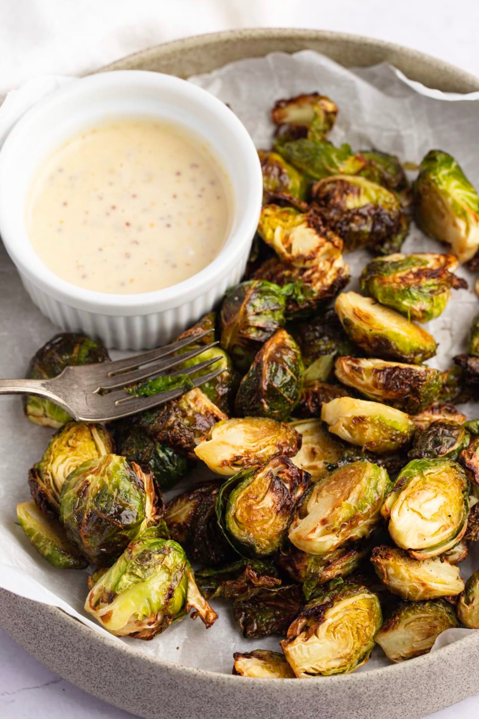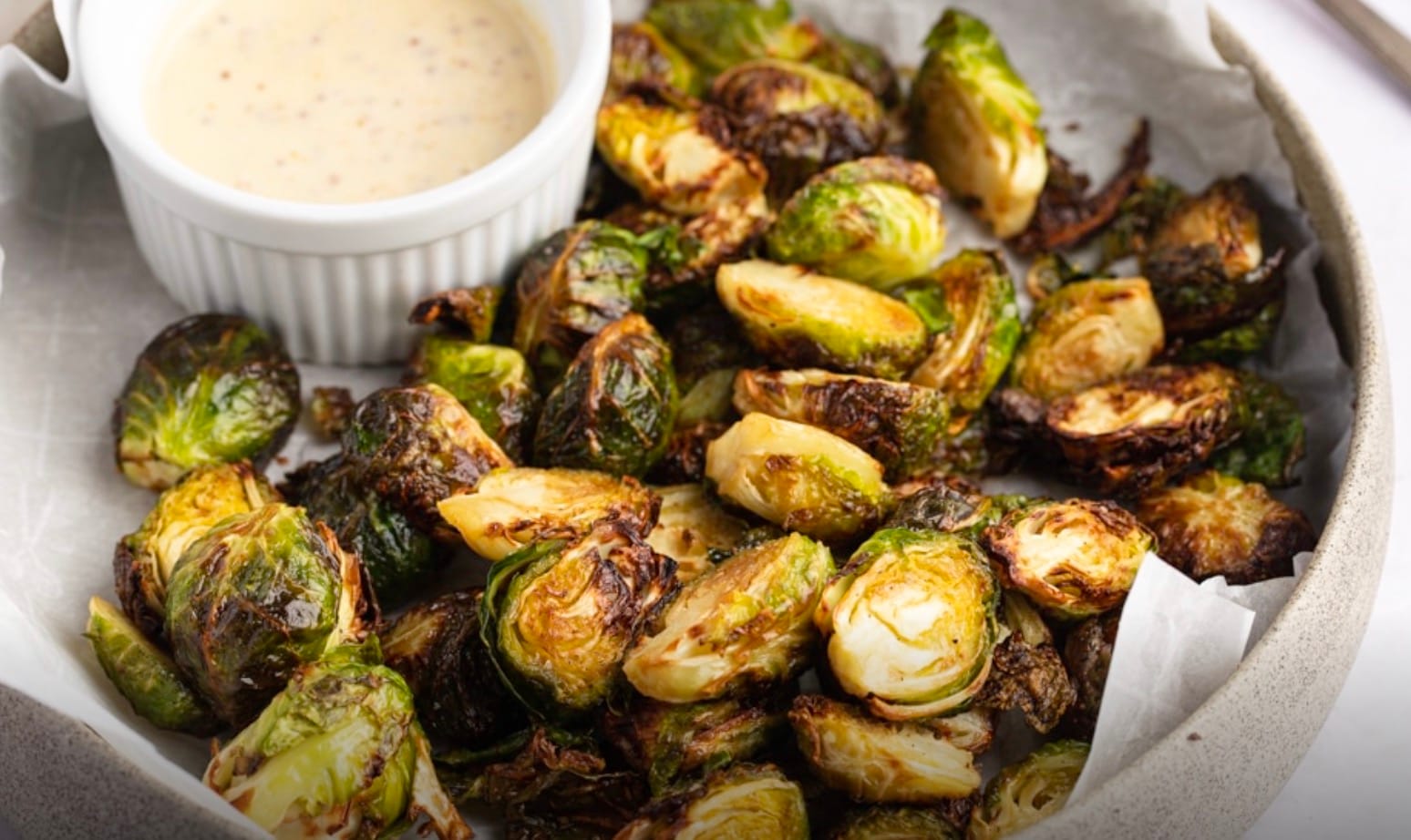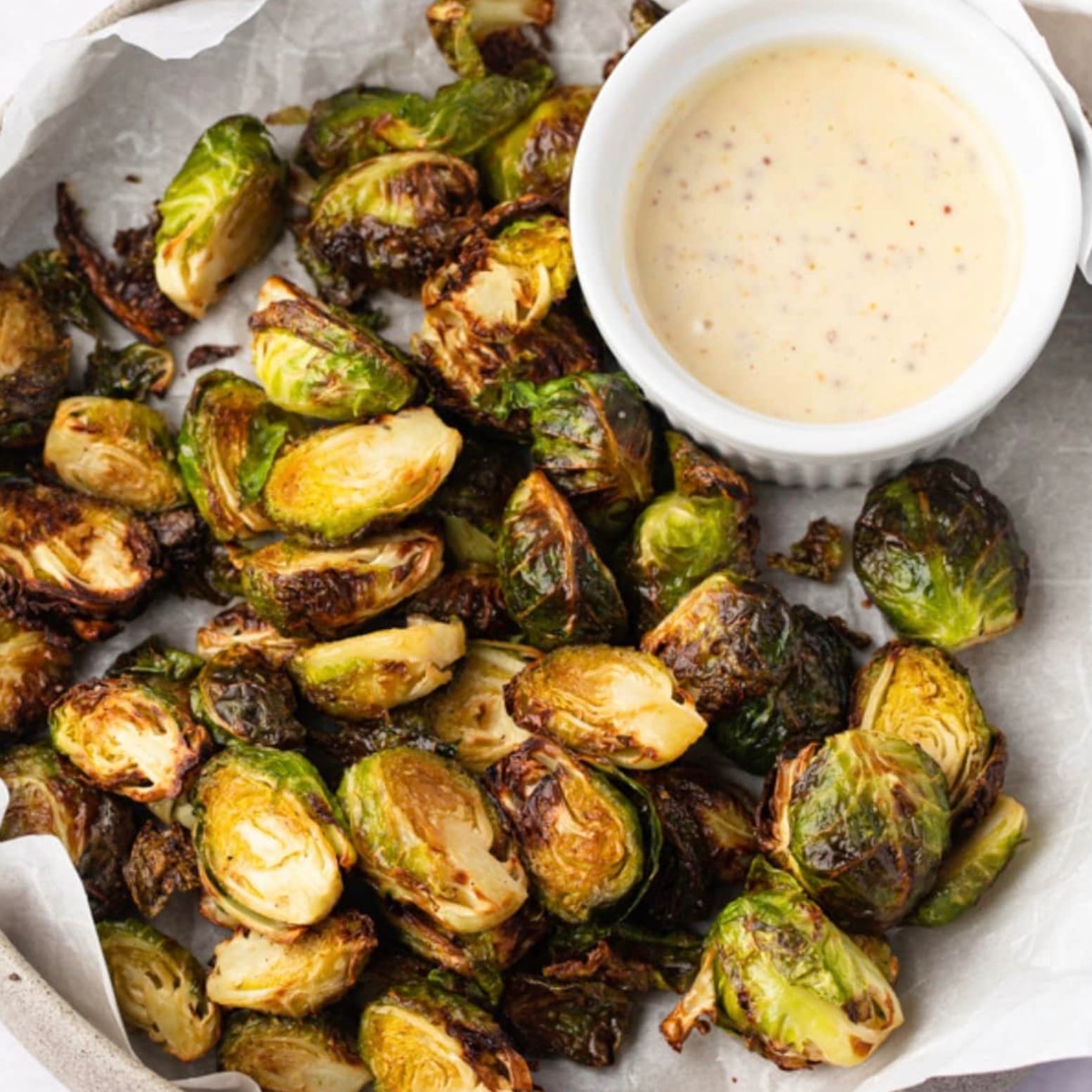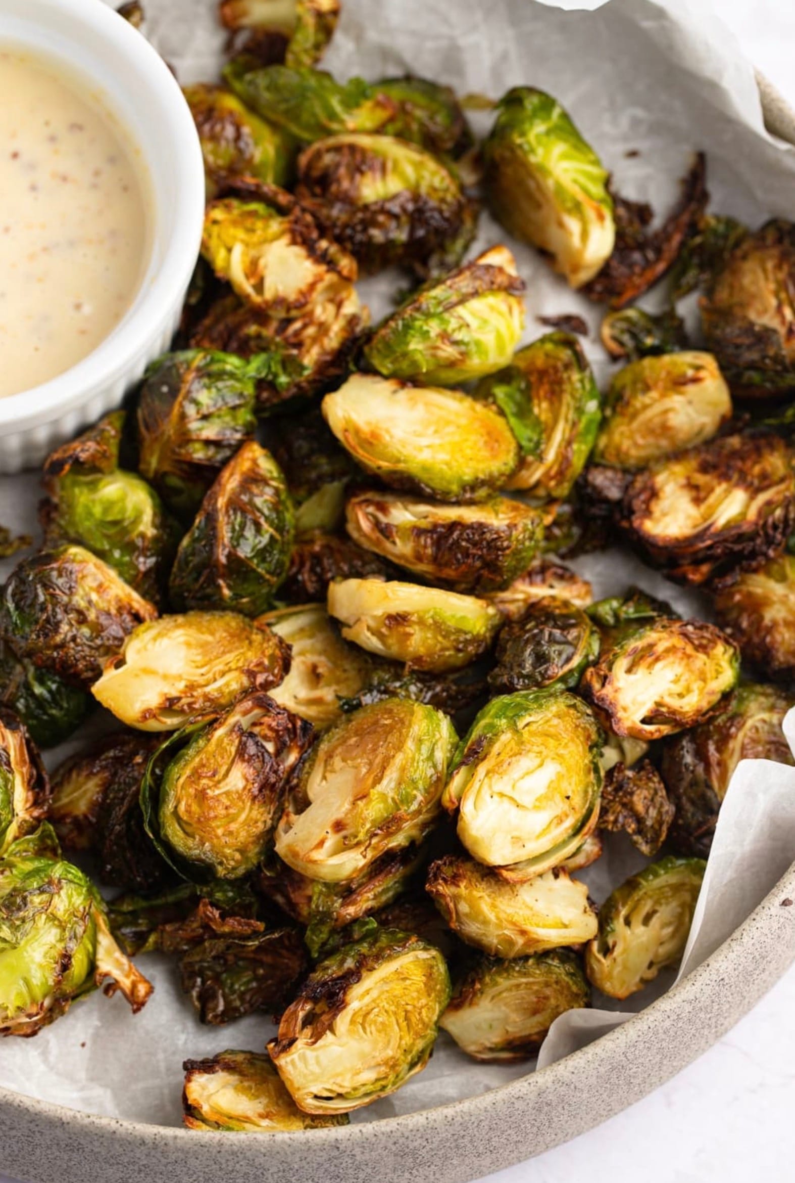 When the sprouts are done, take them out of the air fryer. Serve them hot with the dip on the side. Enjoy your crispy, flavorful Brussels sprouts!