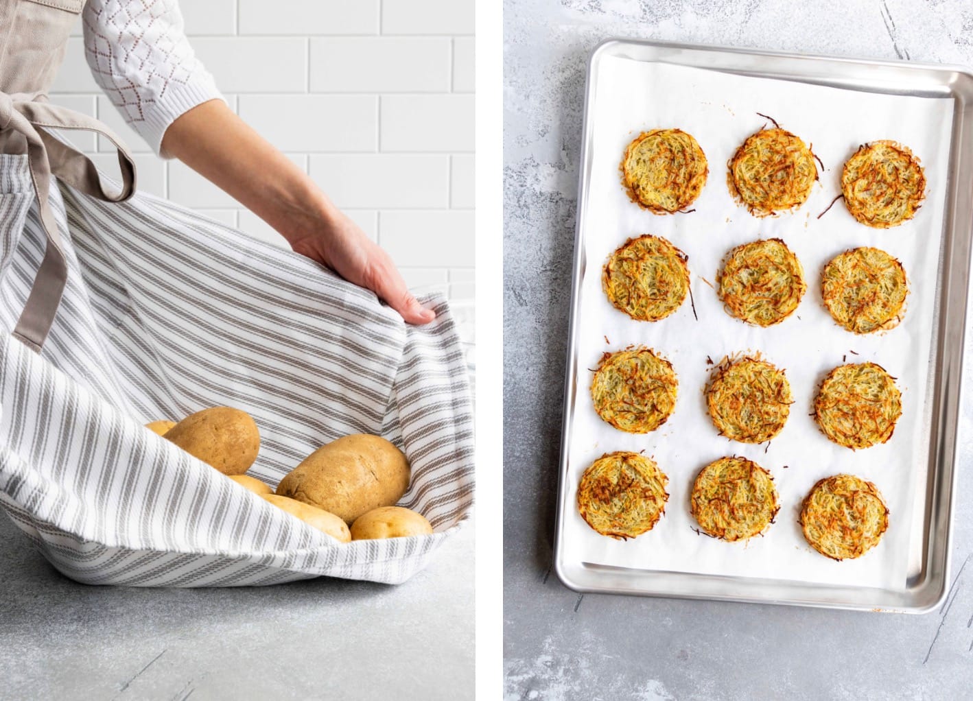 For a time-saving trick, you can shred the potatoes the night before. Just cover them with cold water and store in the fridge. In the morning, drain, rinse, and squeeze dry before seasoning and baking.