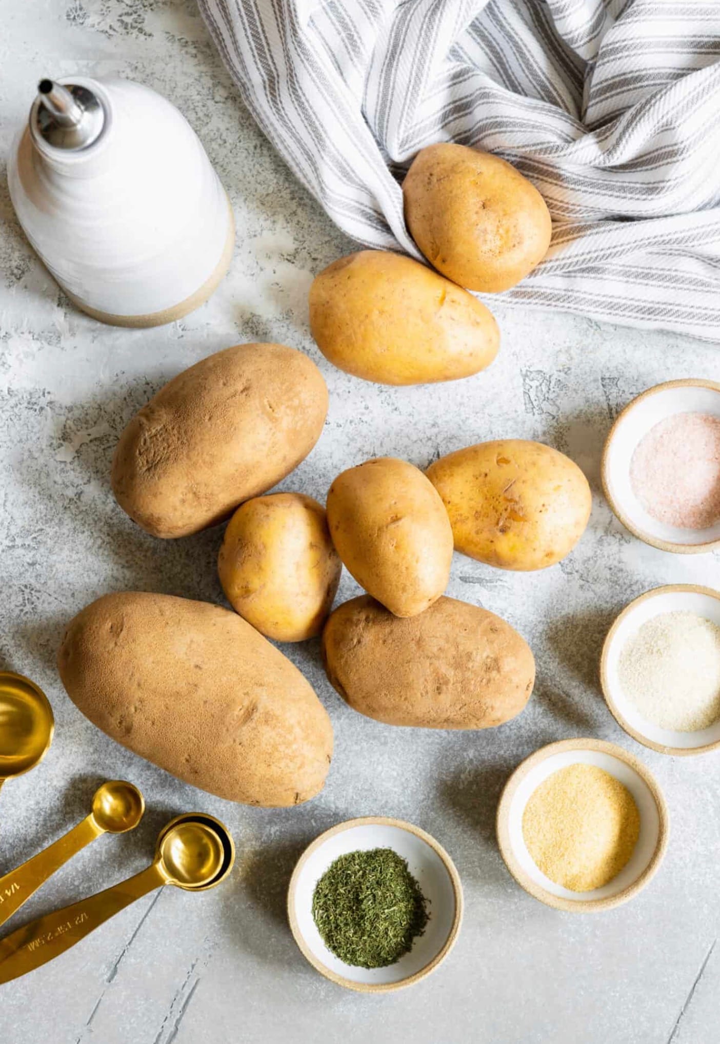 Mix the potatoes with 1 tablespoon olive oil, 2 teaspoons onion powder, 1 1/2 teaspoons garlic powder, 1 teaspoon dried dill, and 3/4-1 teaspoon sea salt. Use your hands to combine everything well.