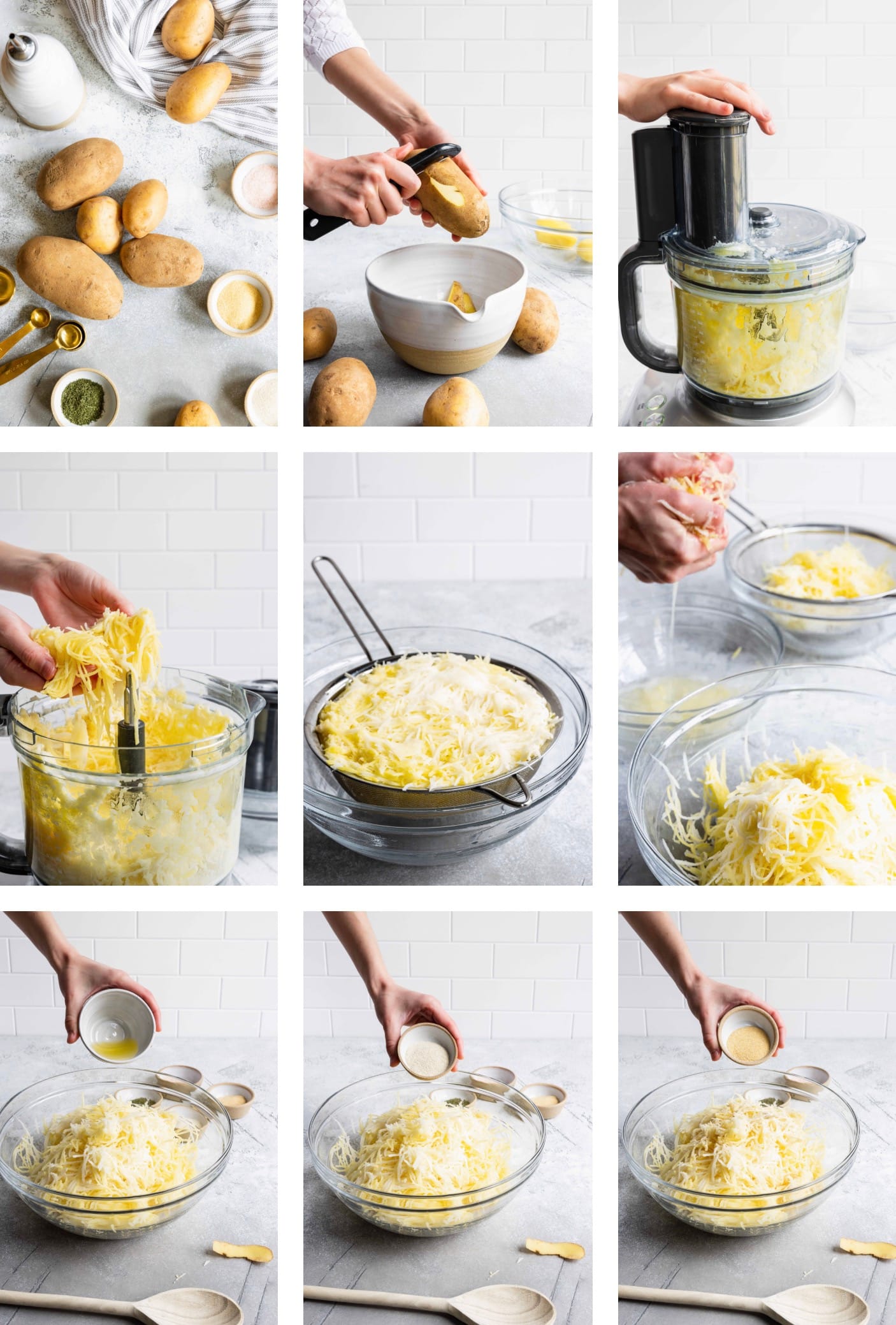 Remember to wash and peel your potatoes before shredding them. A food processor works great for this, but a box grater will do the job too.