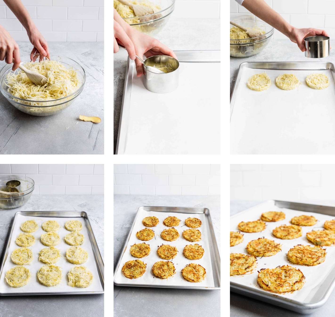 Line a baking sheet with parchment paper. Scoop 1/4 cup of the potato mix for each hash brown. Press them down with a spatula or use a ring mold if you have one.