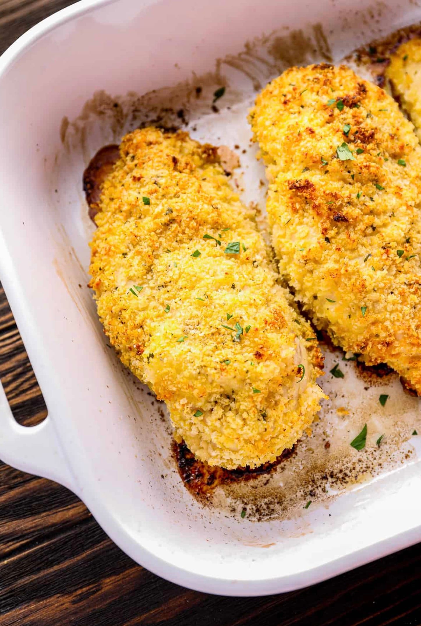 Don’t skip spraying the coated chicken with cooking spray before baking. This helps the crust brown nicely in the oven.