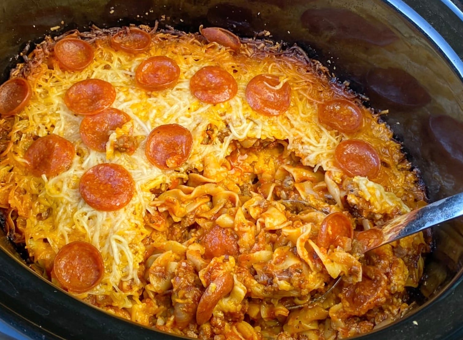 - Layer 1/3 of the noodles, meat sauce, pepperoni, and cheese in the crock-pot. Repeat layers twice until all ingredients are used. Get that cheese evenly distributed!