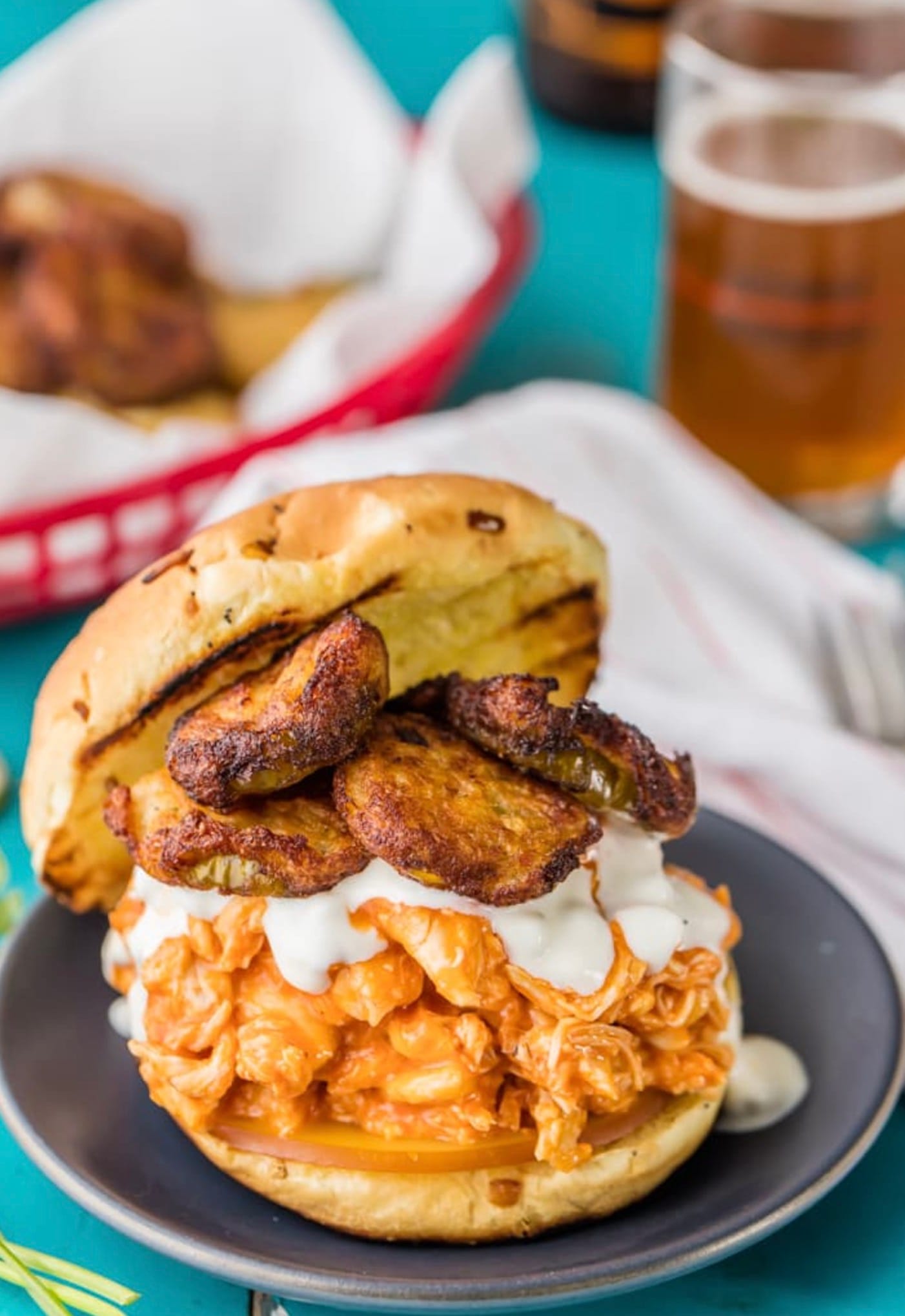 (Optional) Make Sandwiches: To assemble sandwiches, place 1 slice of cheese and a heaping portion of chicken on a toasted bun. Top with ranch or blue cheese dressing and Ranch Fried Pickles.