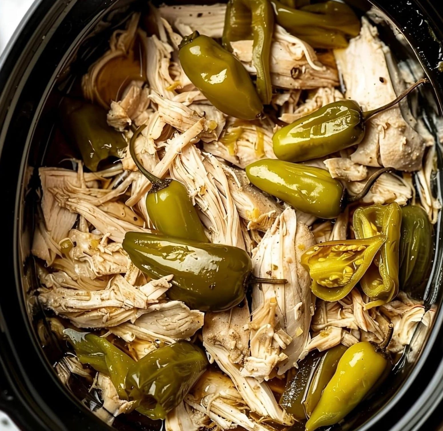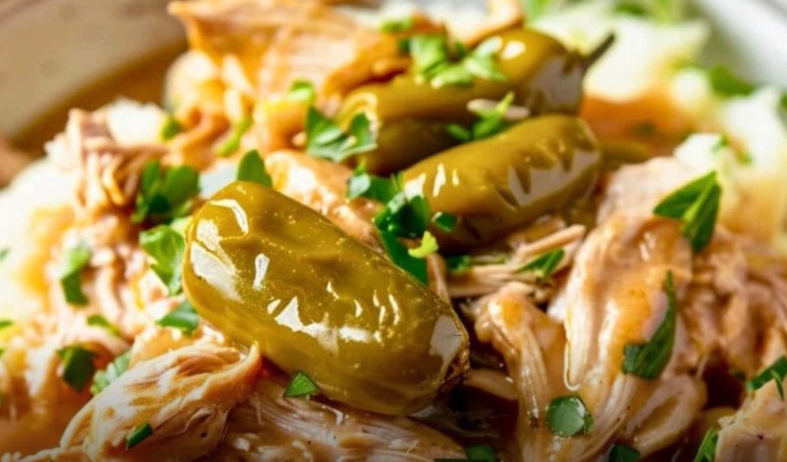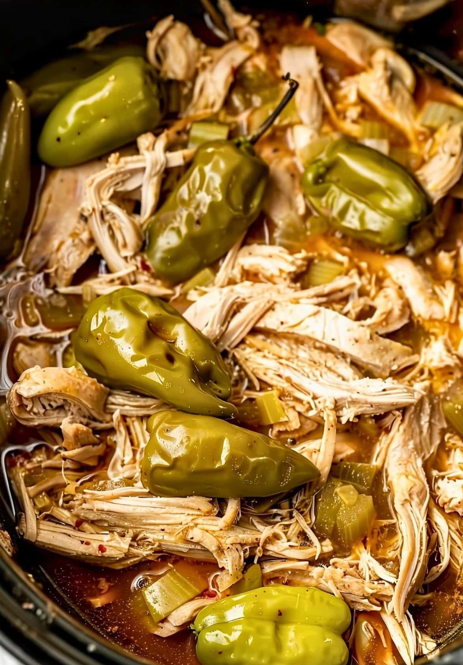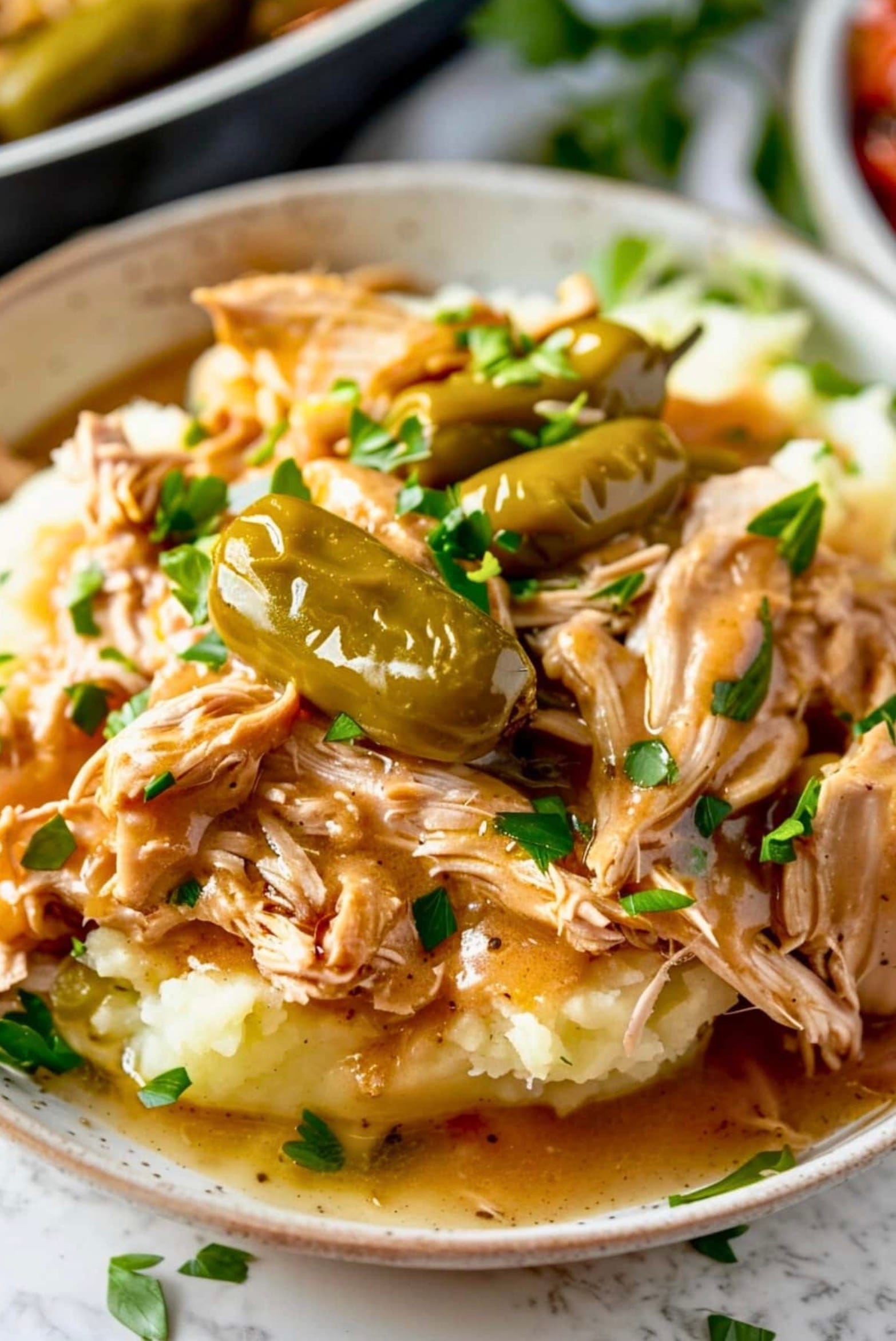 Crockpot Mississippi Chicken is a tasty meal you can make with little effort. You only need a few ingredients and your slow cooker. This dish combines tender chicken with zesty flavors from ranch dressing mix, au jus gravy mix, and pepperoncini peppers.