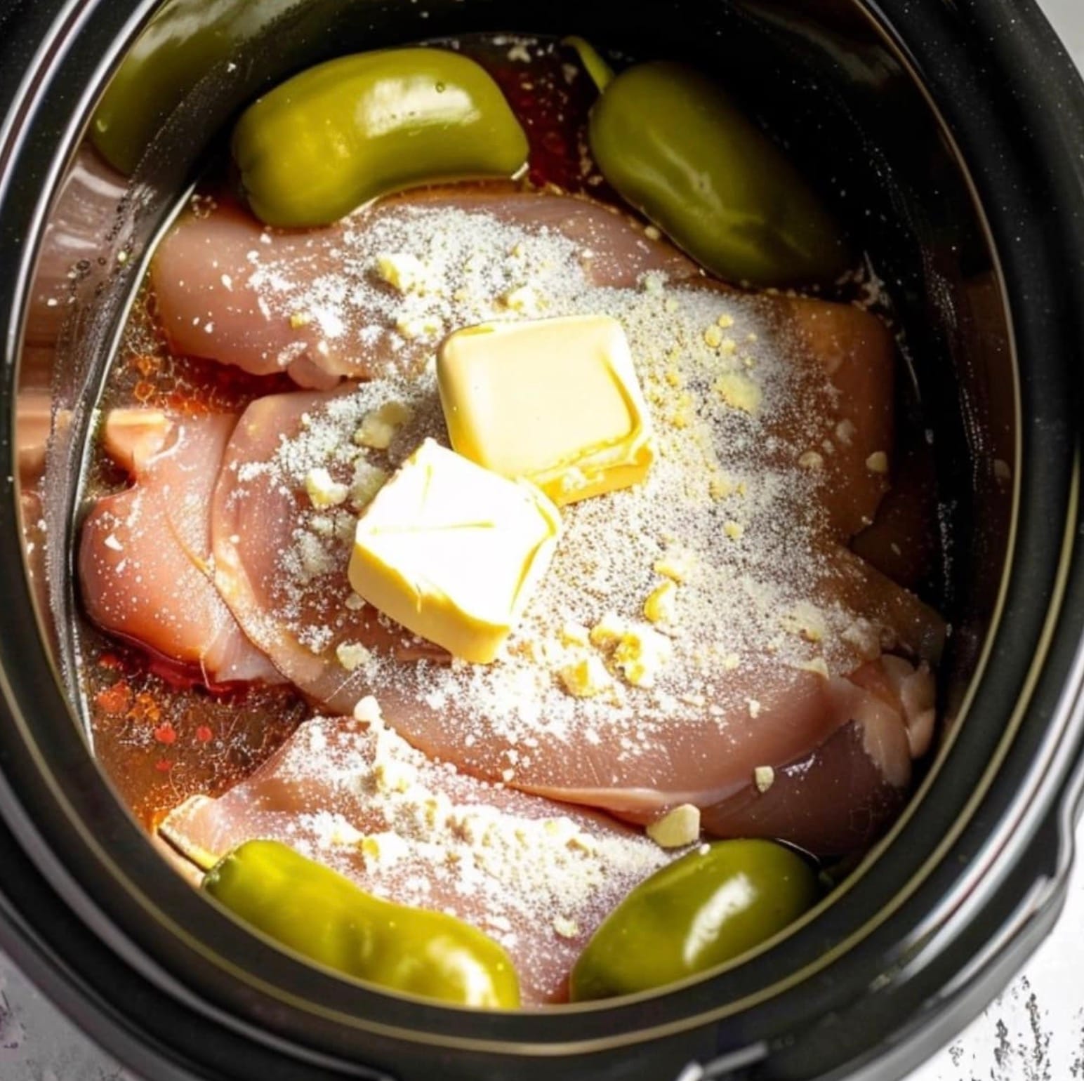 Cut 1/2 cup of butter into pieces. Place these on top of the seasoned chicken. Add 8-10 pepperoncini peppers and pour in 1/2 cup of the pepper juice.