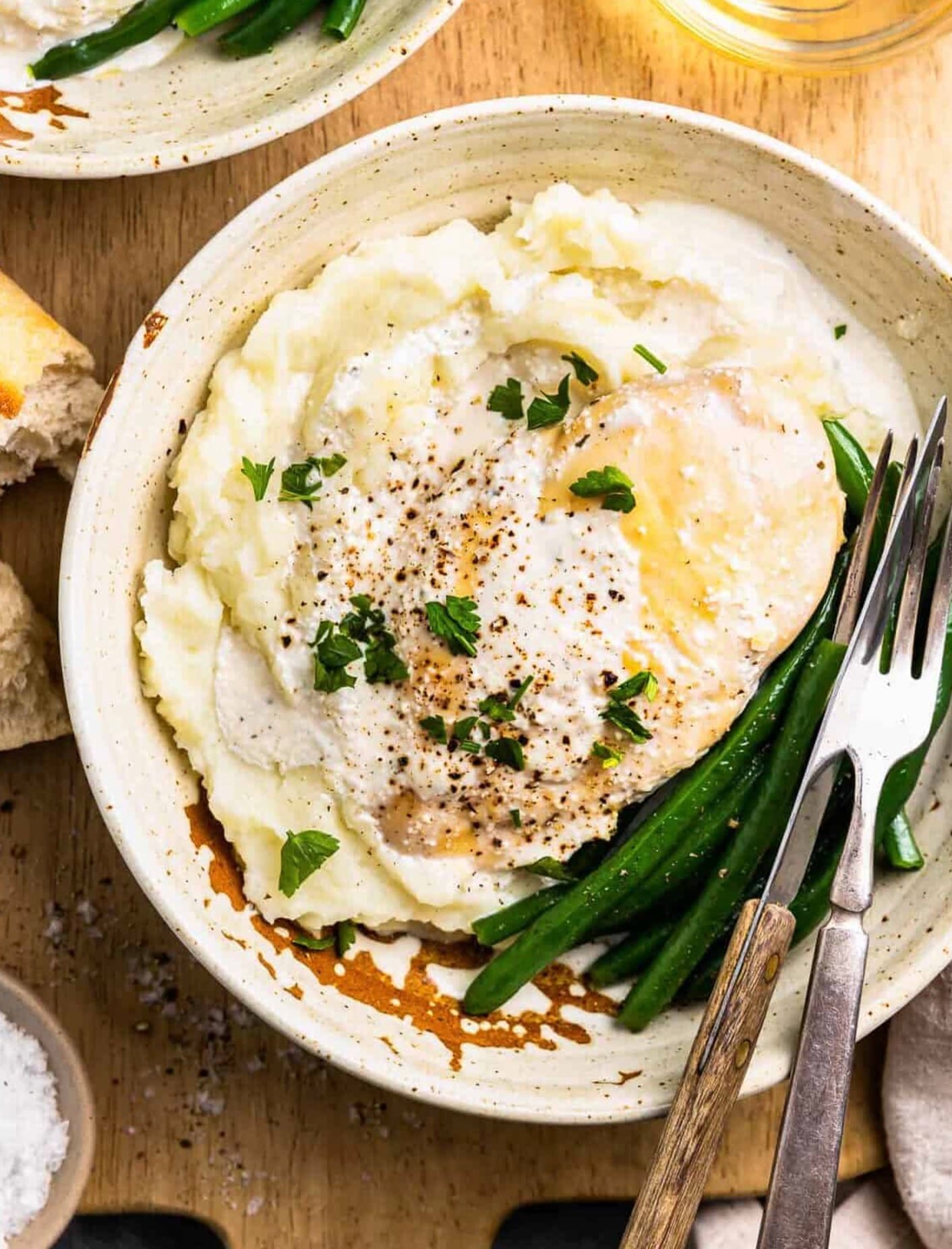 Sprinkle some crispy bacon bits and shredded cheddar on top before serving for extra indulgence. A garnish of fresh chopped parsley adds a pop of color too.