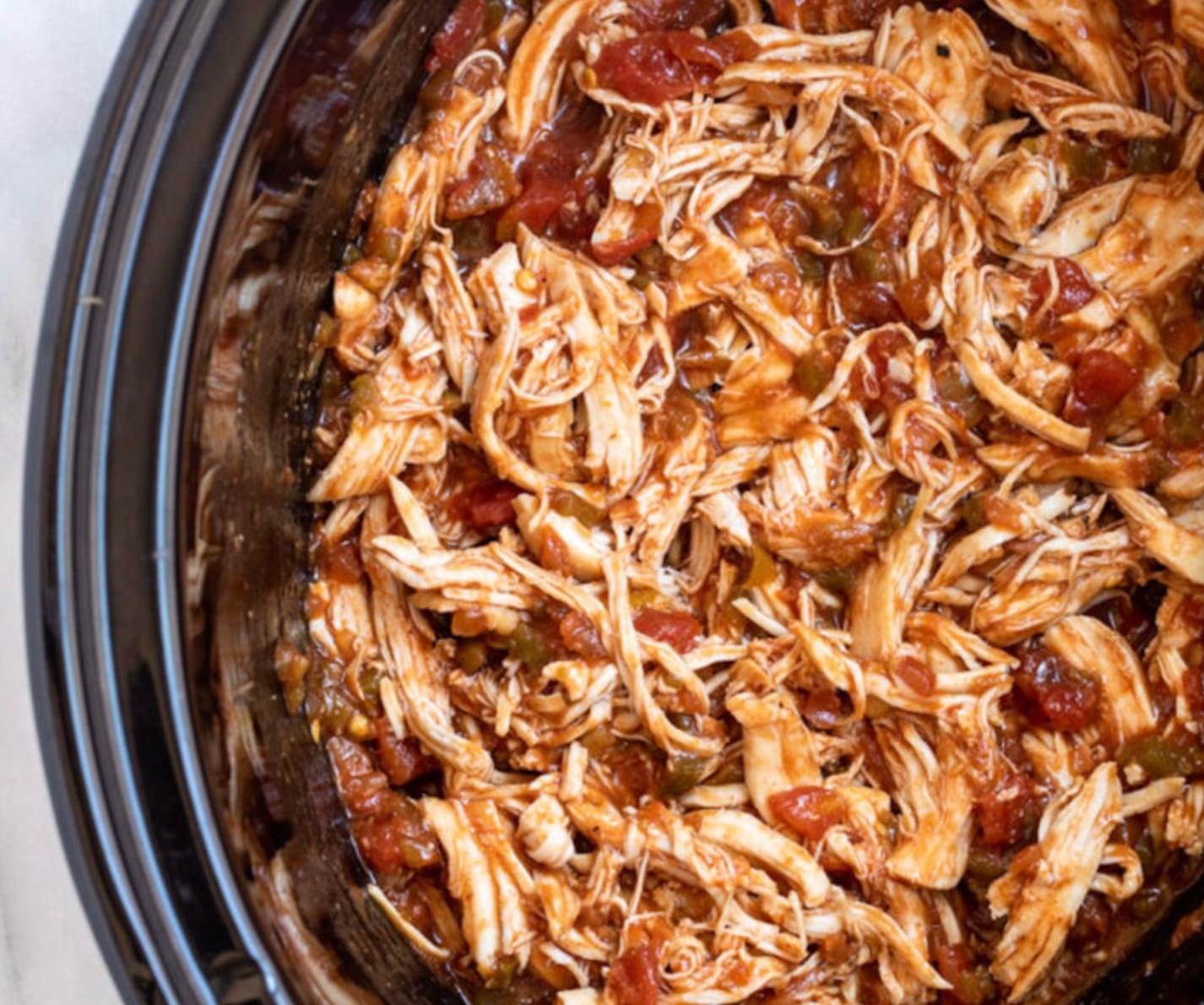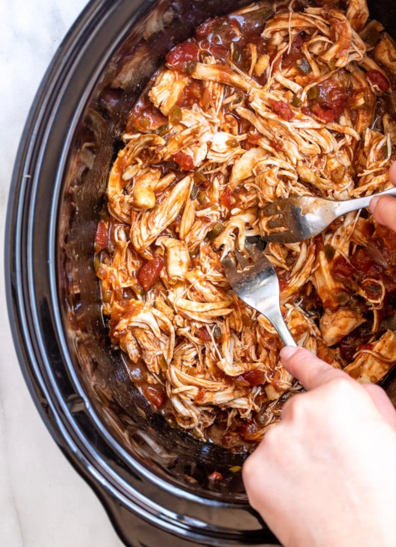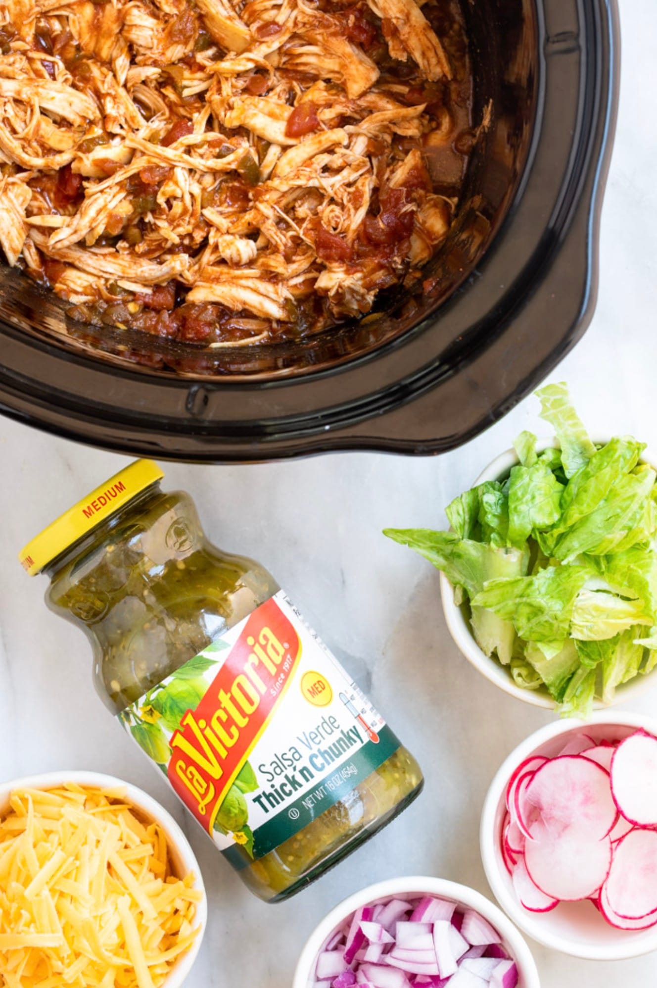 Shred the chicken right in the slow cooker. It’s easier and keeps the meat warm.