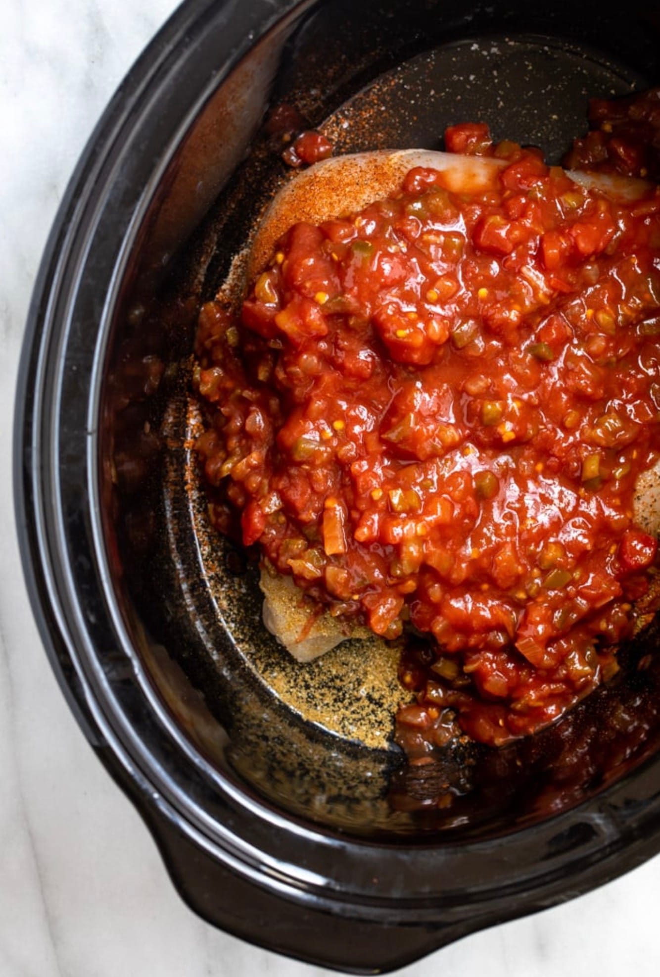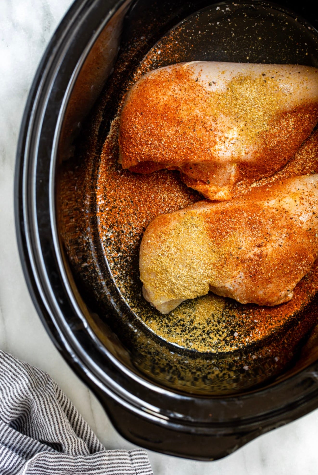 - Add chicken and spices to slow cooker