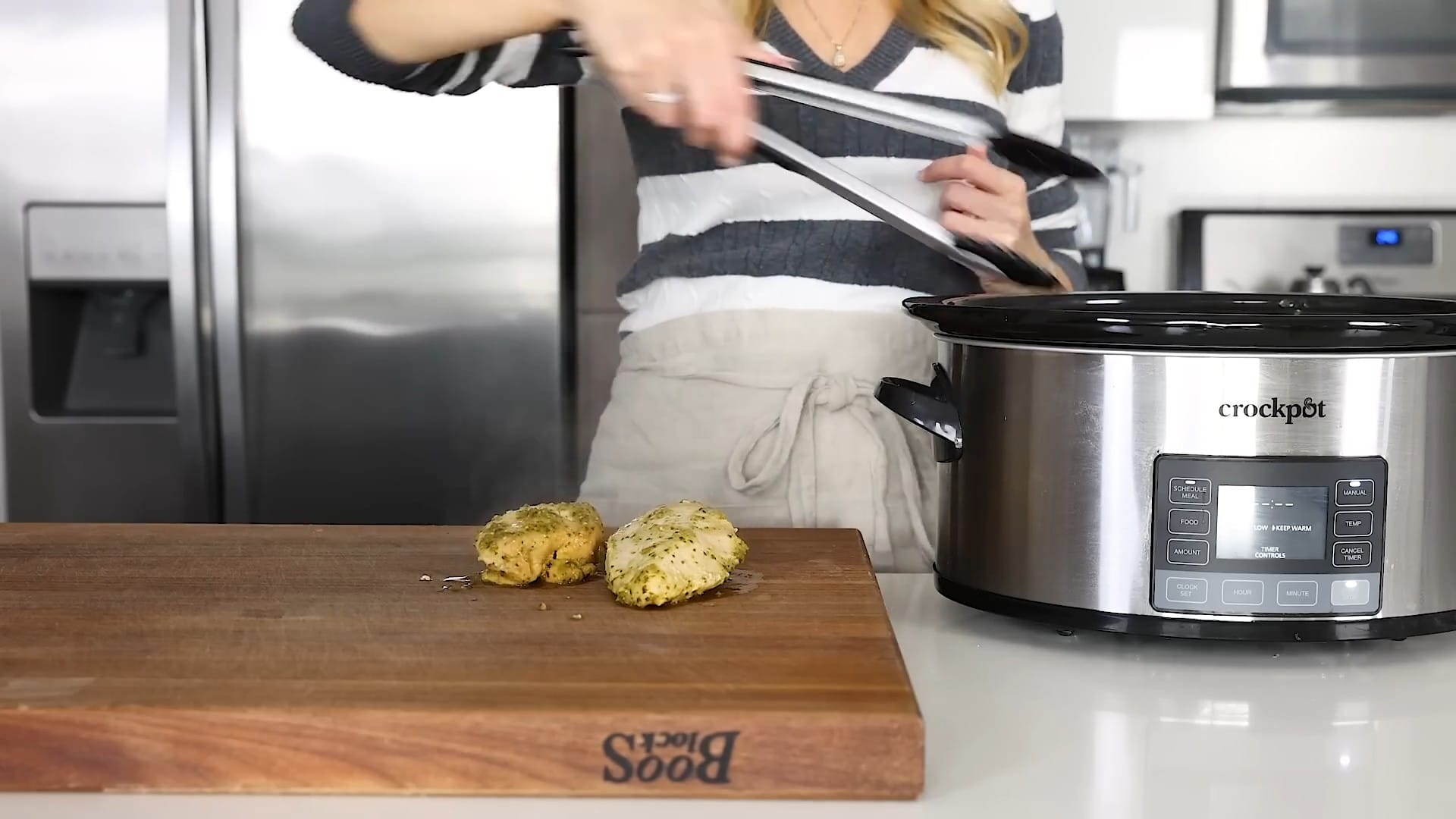 Remove the chicken breasts from the crockpot.