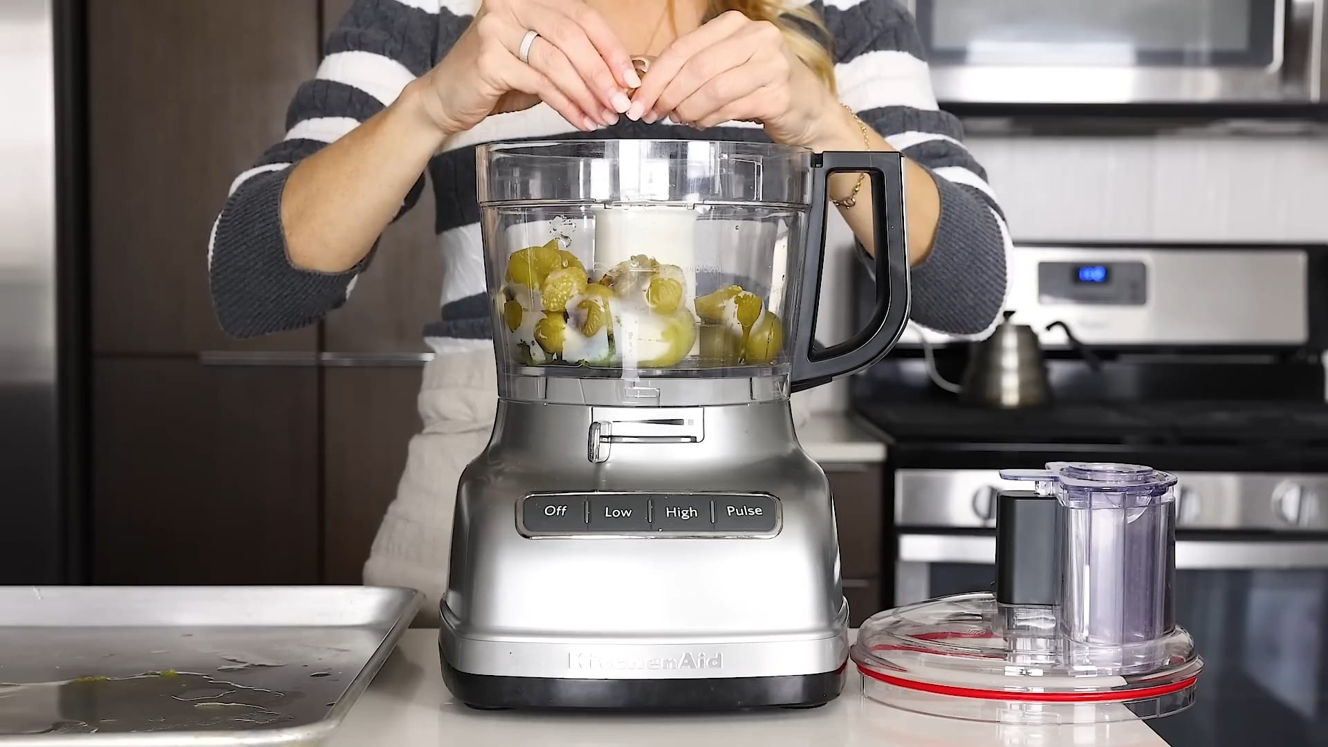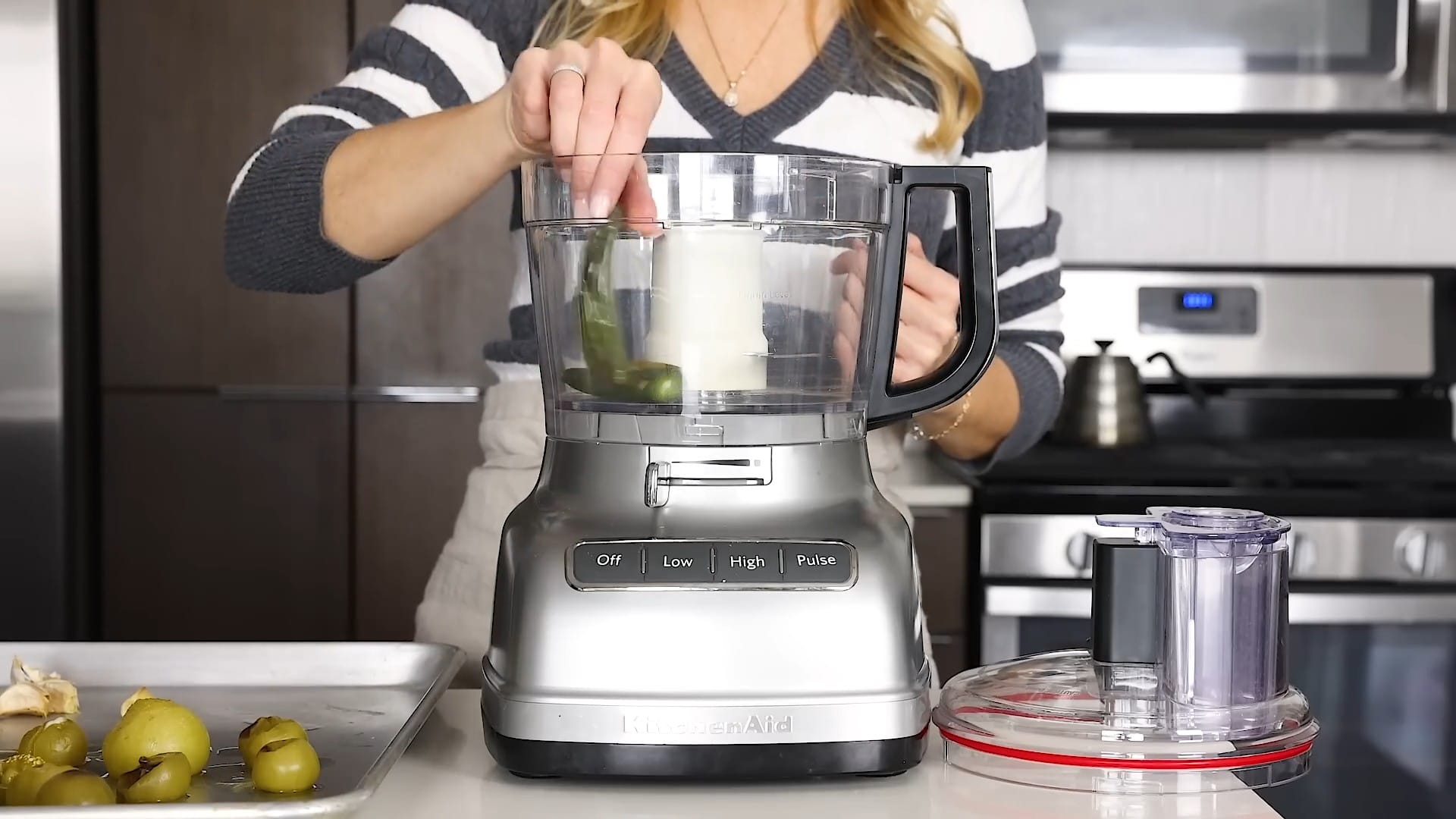 Peel the garlic cloves and add them to the food processor.