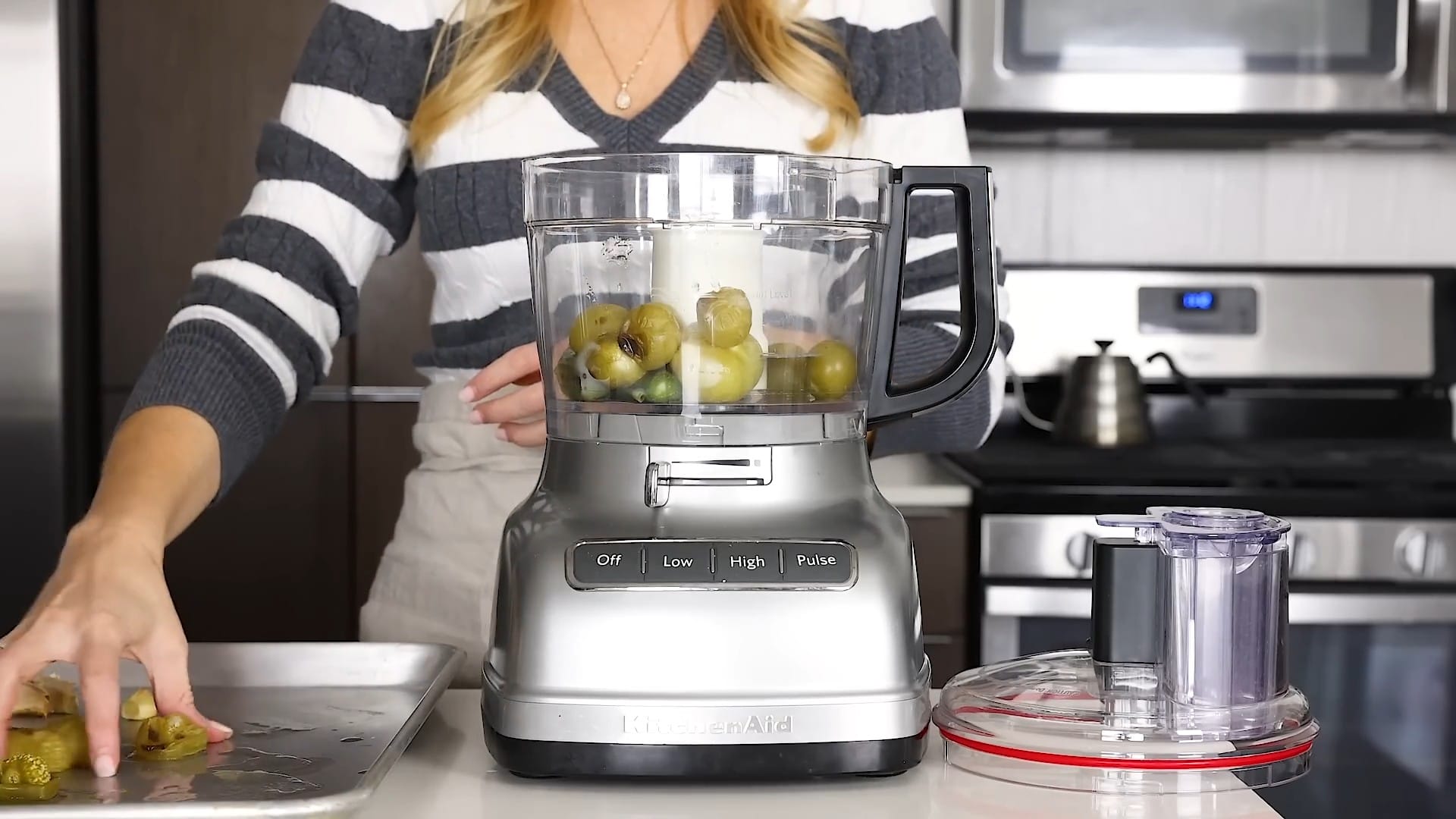 Pour the tomatillo juices from the baking sheet into the food processor.