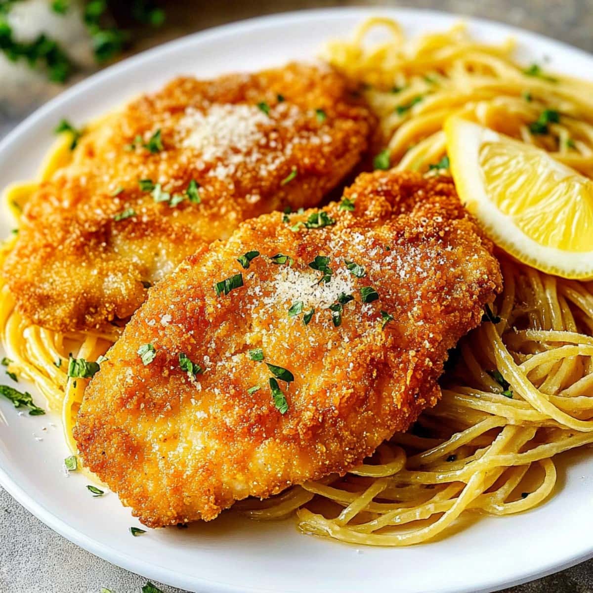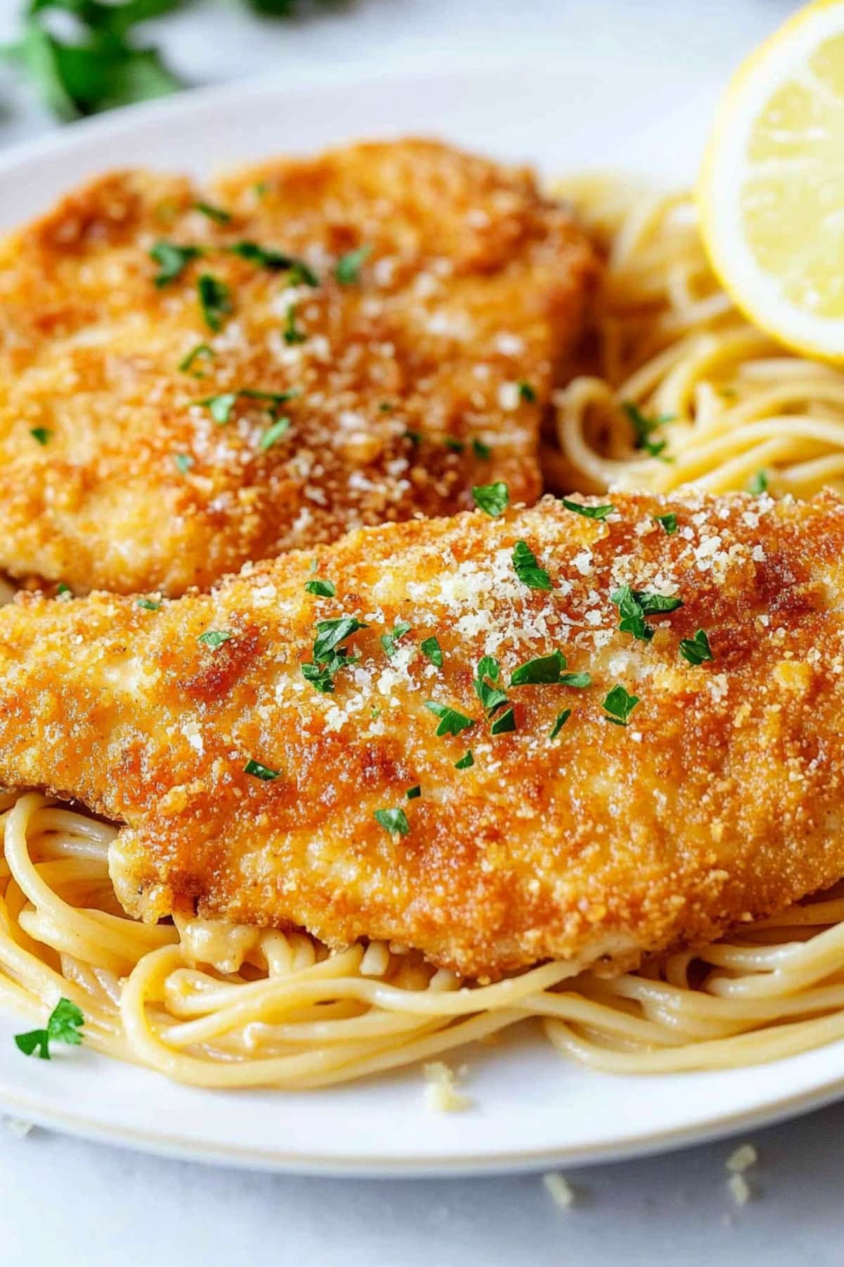Serve your crispy chicken with pasta and your favorite sauce. Sprinkle extra Romano cheese on top and add a squeeze of lemon for extra flavor. Enjoy your homemade Cheesecake Factory-style meal!