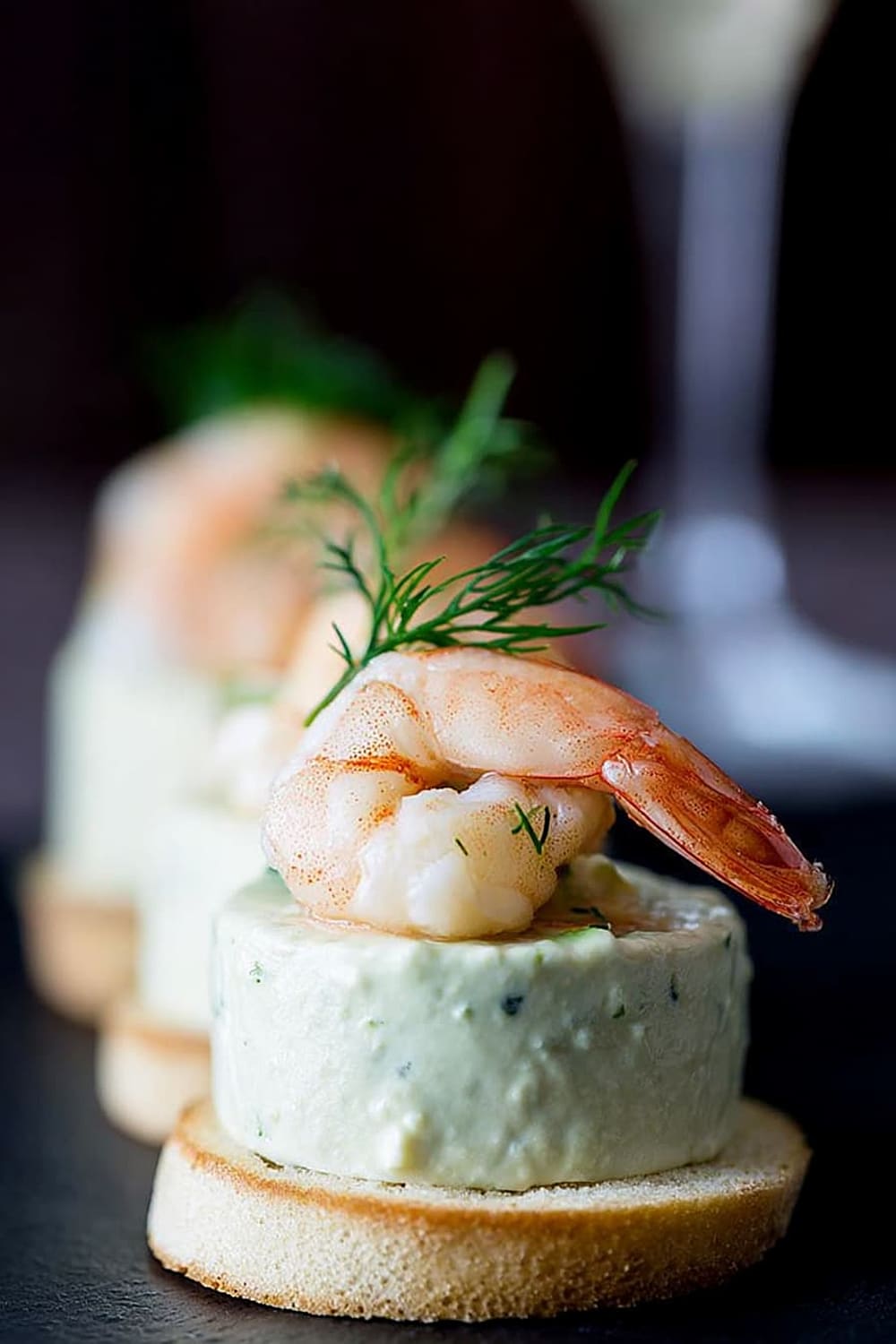 - Using a flat knife, carefully transfer each mousse bite onto a toast round, then crown with a shrimp and fresh dill sprig. Serve immediately for best texture contrast.