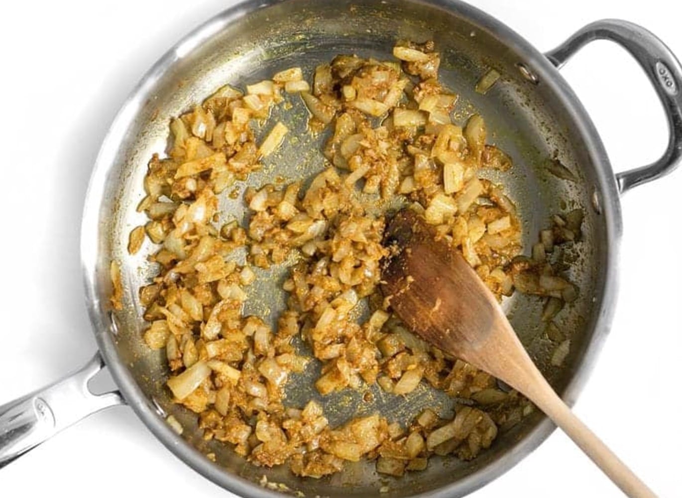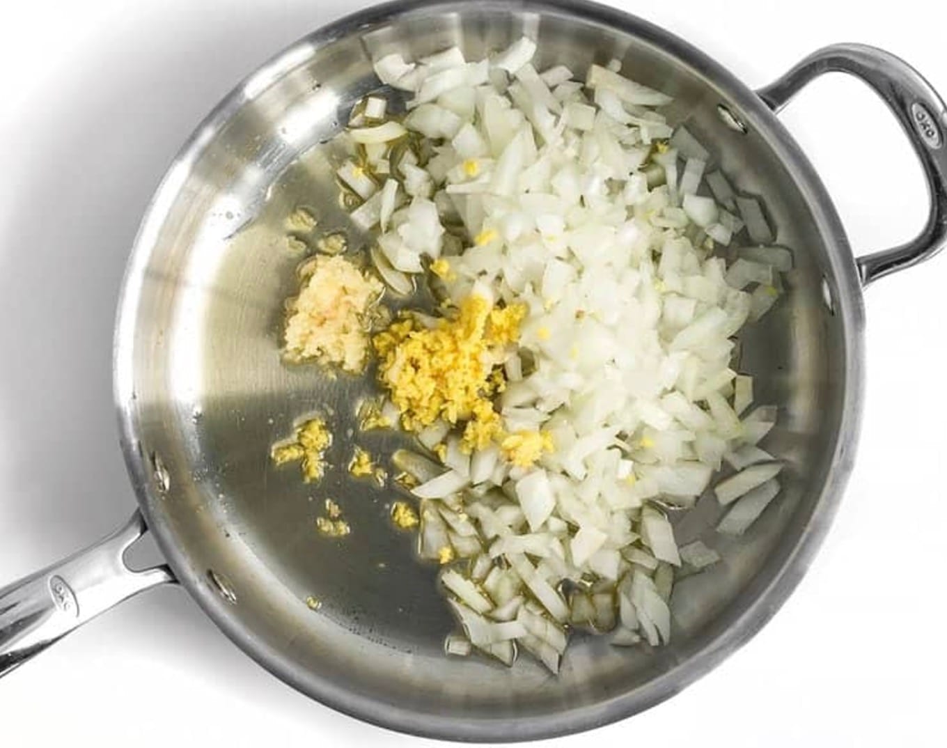 You’ll start by prepping your veggies. Dice the onion, mince the garlic, and grate the ginger. Heat olive oil in a big skillet over medium heat. Toss in the onion, garlic, and ginger. Cook until the onions are soft, about 3-5 minutes.