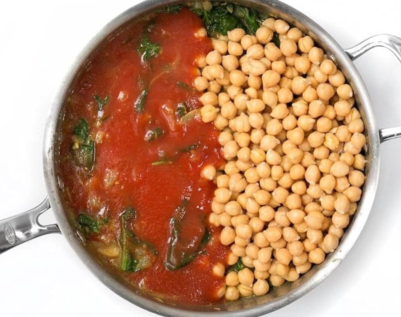Don’t forget to rinse and drain your chickpeas before adding them to the pan. You can use fresh or frozen spinach, whichever you prefer or have on hand.