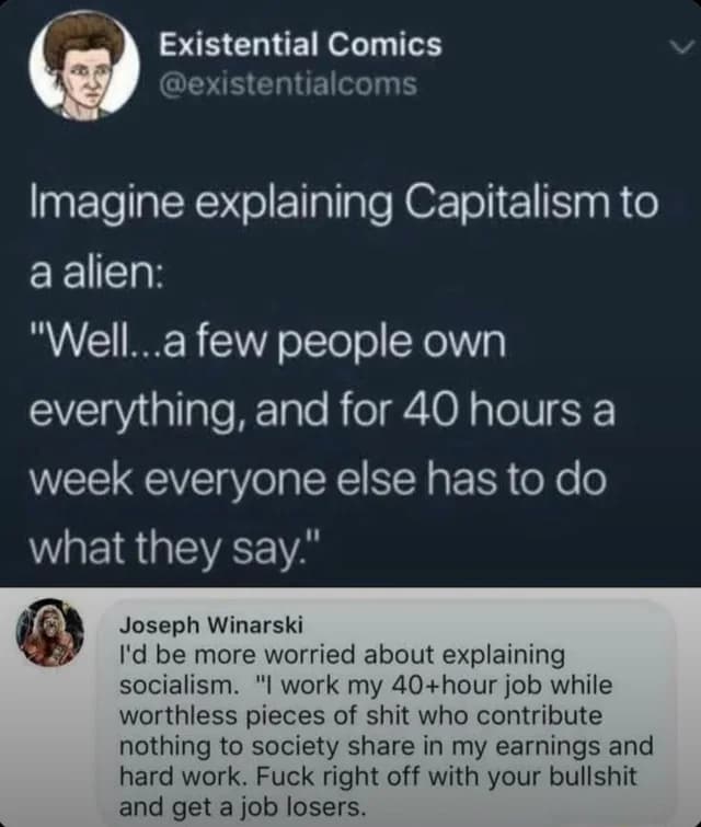 A user offered a definition of capitalism focused on initiative: “How about something a bit more accurate: A system in which those with good ideas and initiative create business that provide goods and services people want, and jobs for those who don’t have what it takes or the desire to create business.”