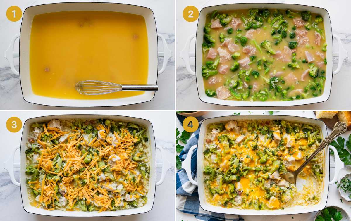In the dish, mix the cream of chicken soup and broth or water. Stir in the uncooked rice, chicken, and frozen broccoli.