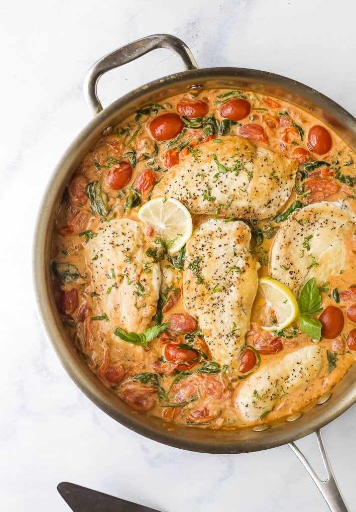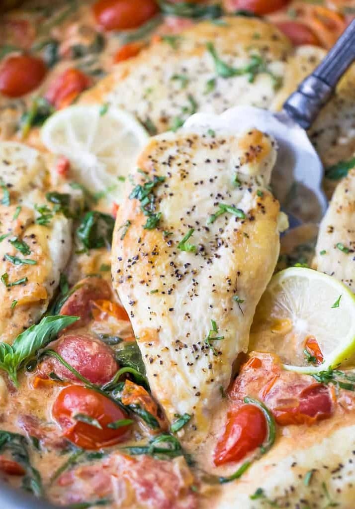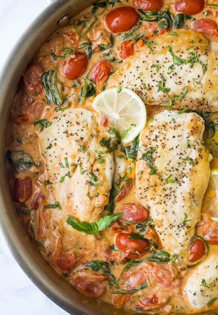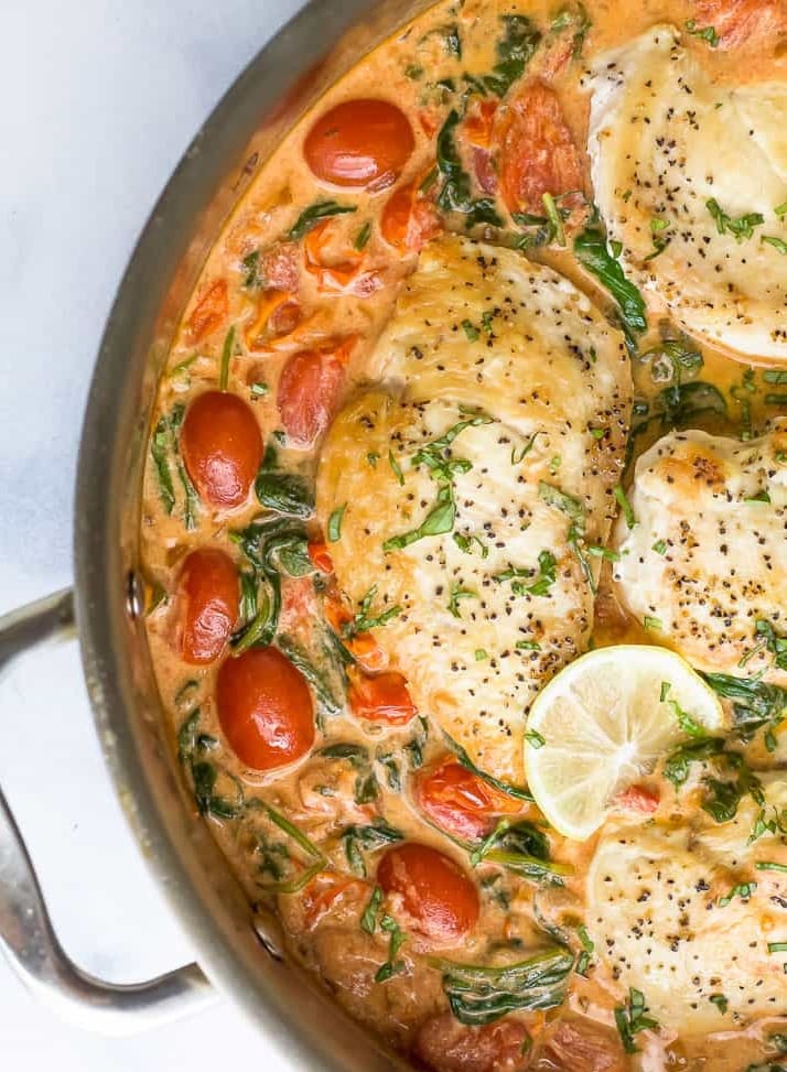 The dish features juicy chicken breasts in a creamy garlic sauce with spinach and tomatoes. It’s packed with flavor and looks impressive, but it’s actually super easy to make. You’ll love how the cherry tomatoes burst in the pan, adding a pop of color and taste to the creamy sauce.