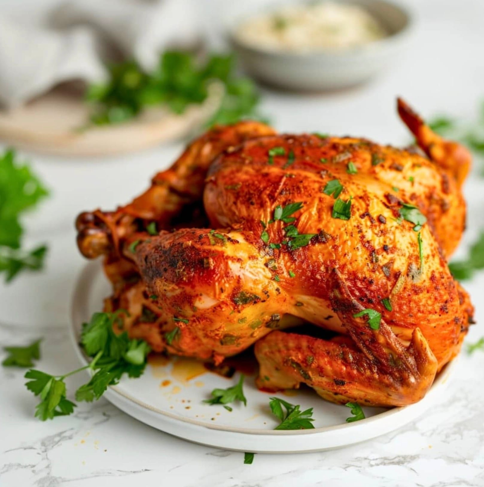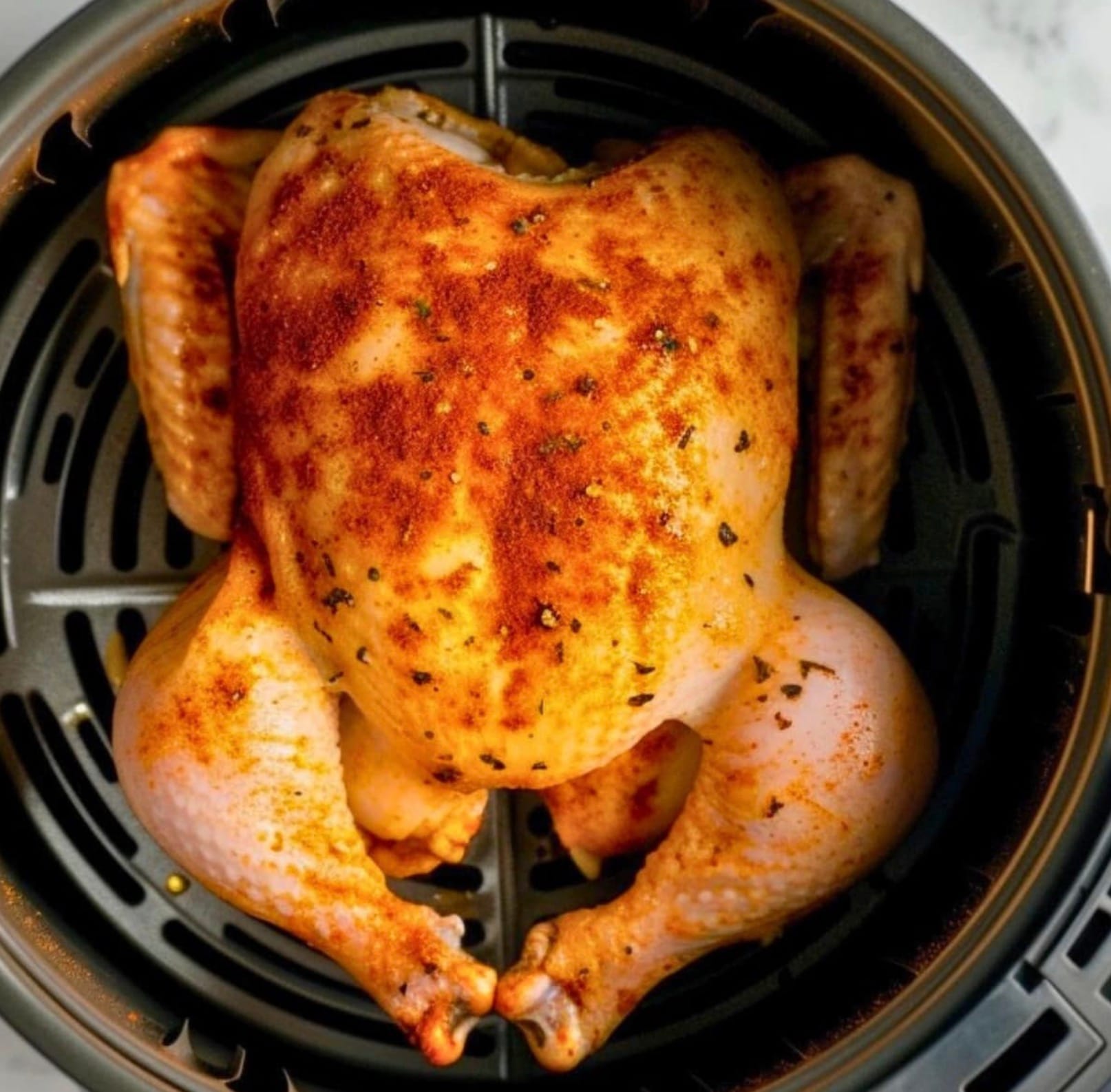 You only need a few basic ingredients and spices to make this delicious chicken. The air fryer does most of the work for you. Just season the bird, pop it in the basket, and let it cook. You’ll have a golden-brown chicken with crispy skin that your family will love.