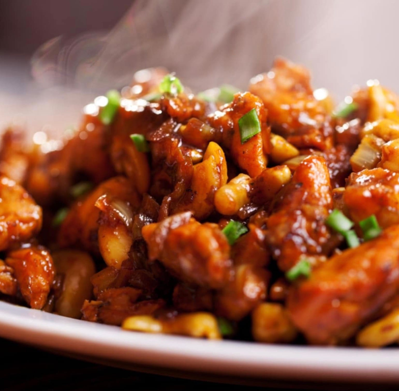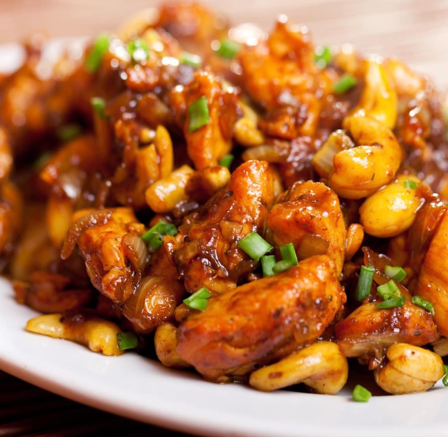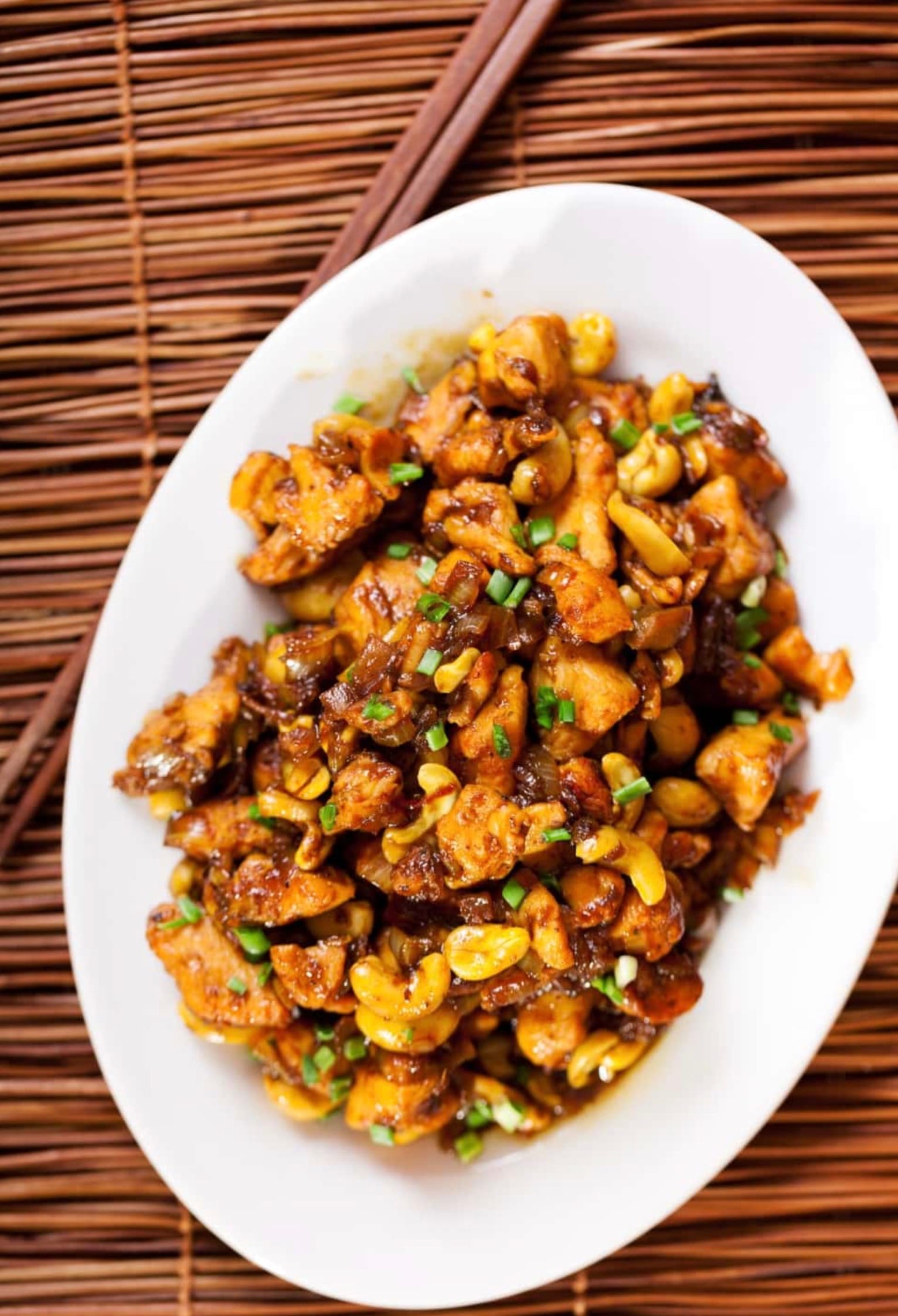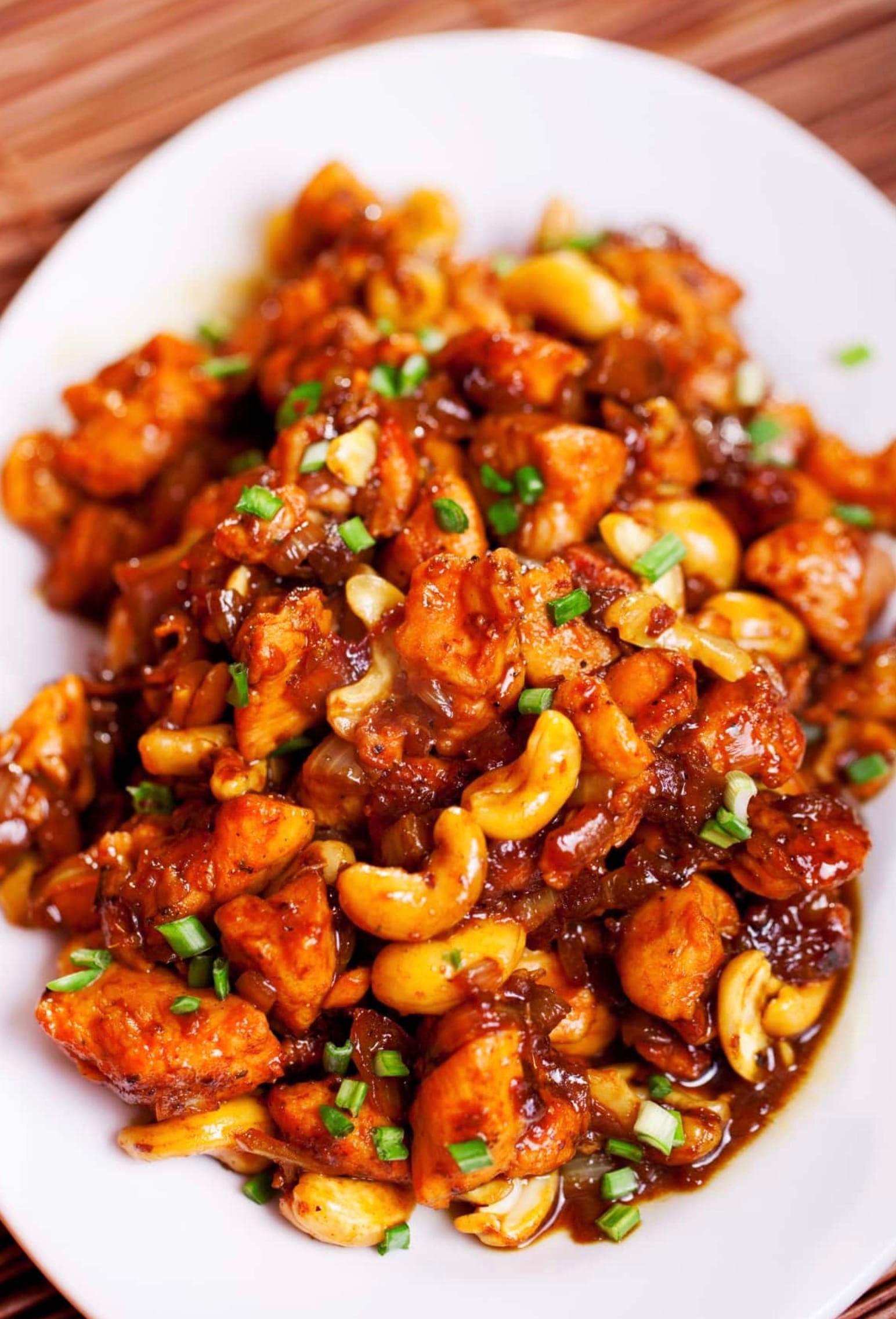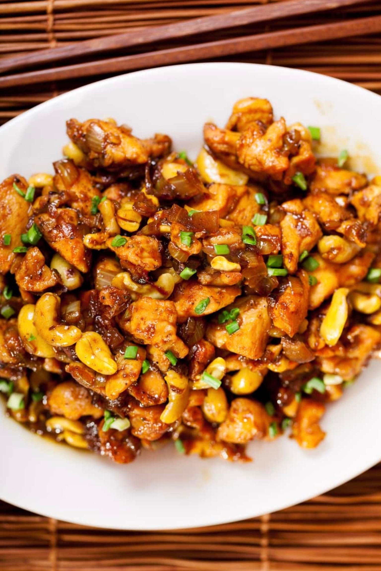 Serve your cashew chicken over rice or noodles. Sprinkle green onions on top for a pop of color and fresh flavor. Enjoy your homemade takeout-style meal!