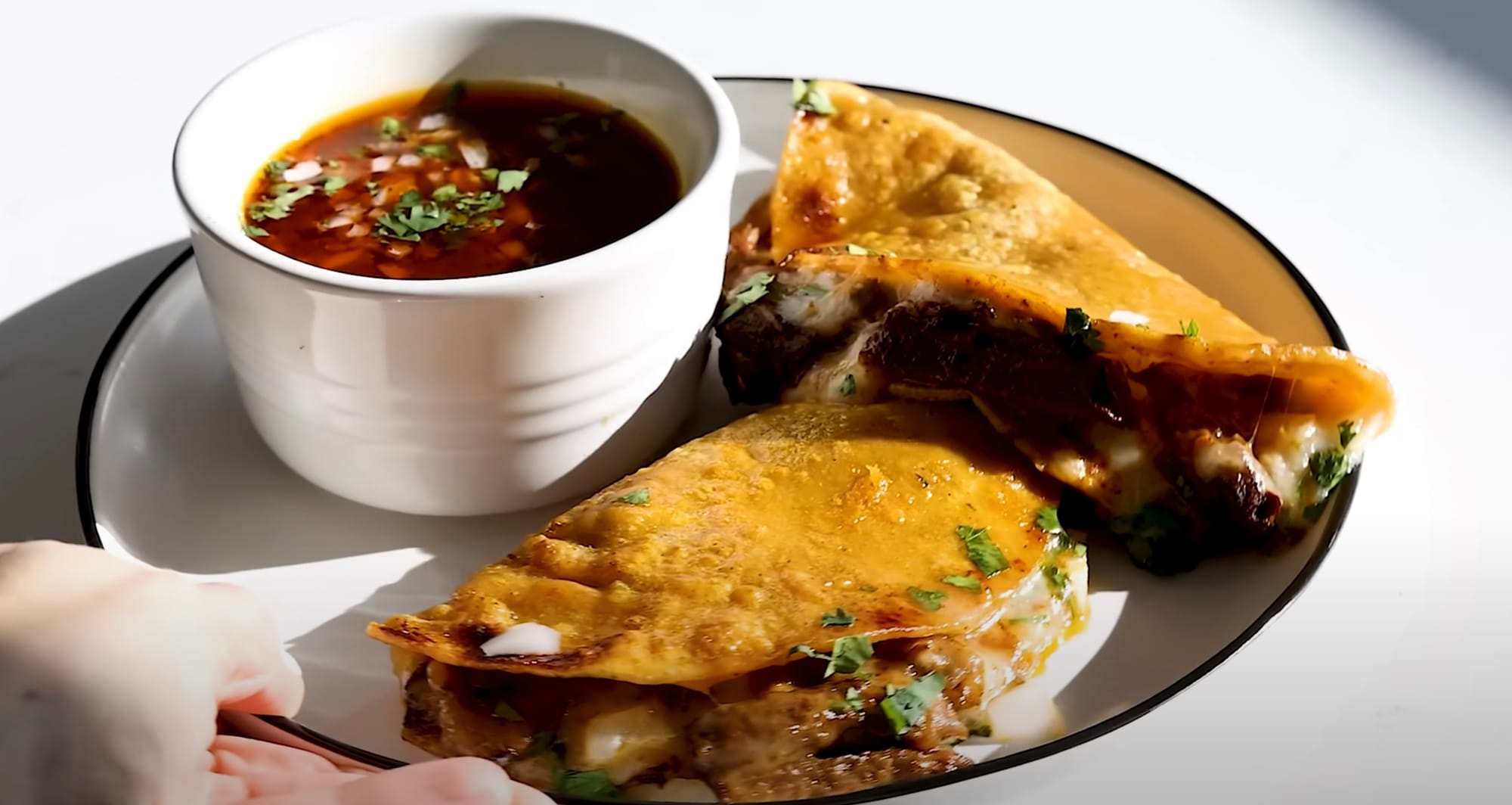 Add shredded birria, onion, and cilantro to one half of each tortilla.