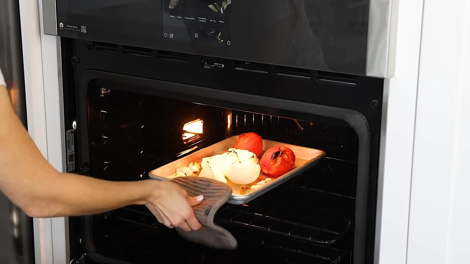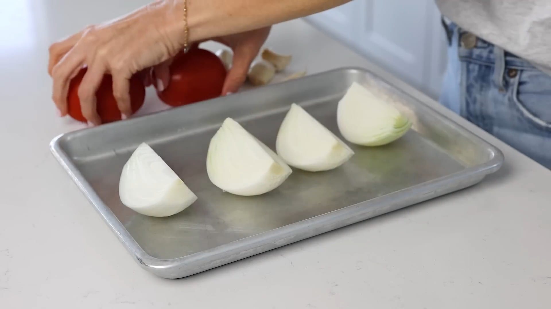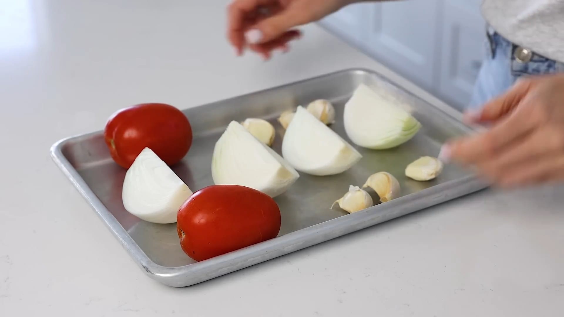 Place the quartered onion, 2 Roma tomatoes, and 6 unpeeled garlic cloves on a small sheet pan.