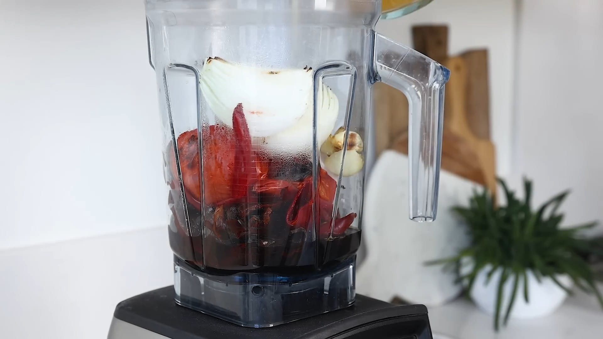 Squeeze the roasted garlic cloves out of their peels and add them to the blender, along with the roasted tomatoes and onion.
