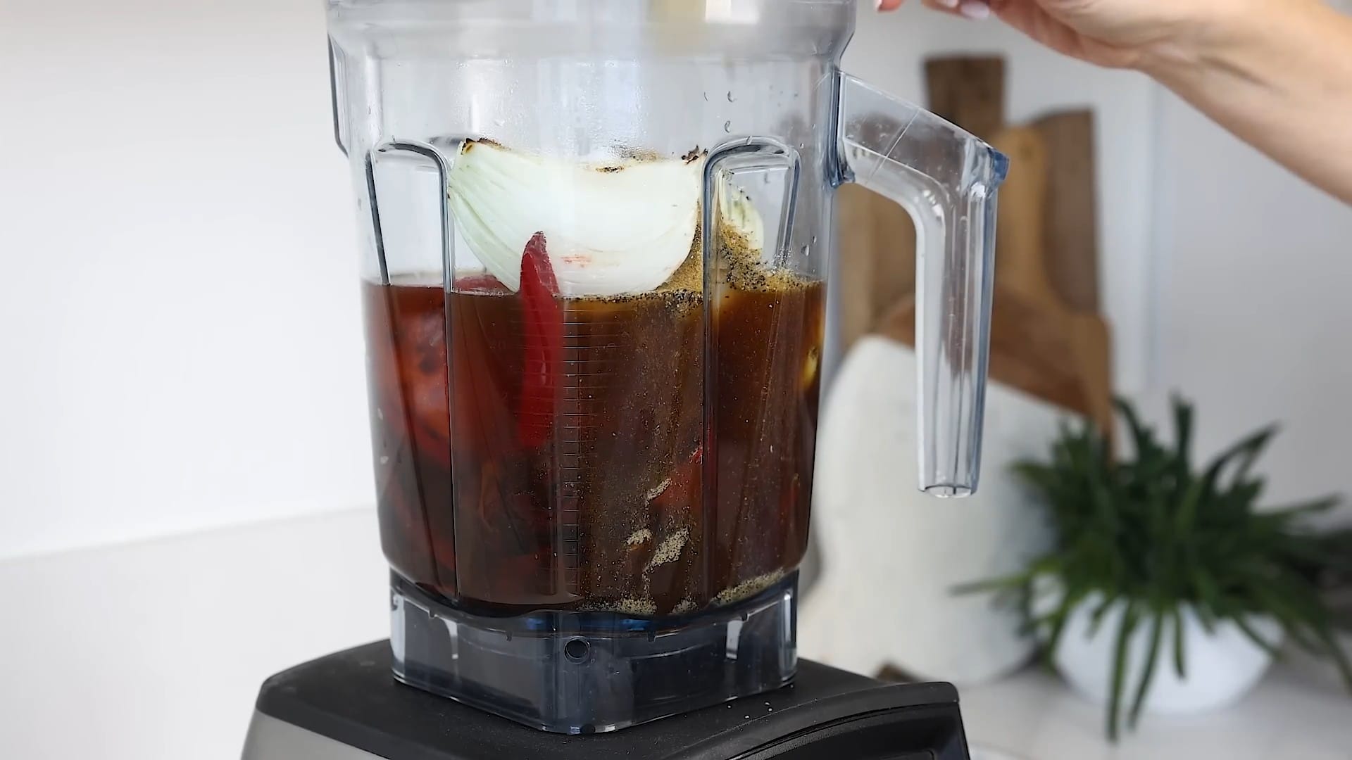 Add 2 cups beef broth, 2 tablespoons apple cider vinegar, 2 teaspoons kosher salt, 1 teaspoon black pepper, 1 teaspoon cumin, 1 teaspoon Mexican oregano, ½ teaspoon ground cloves, ½ teaspoon cinnamon, and ¼ teaspoon ginger to the blender.