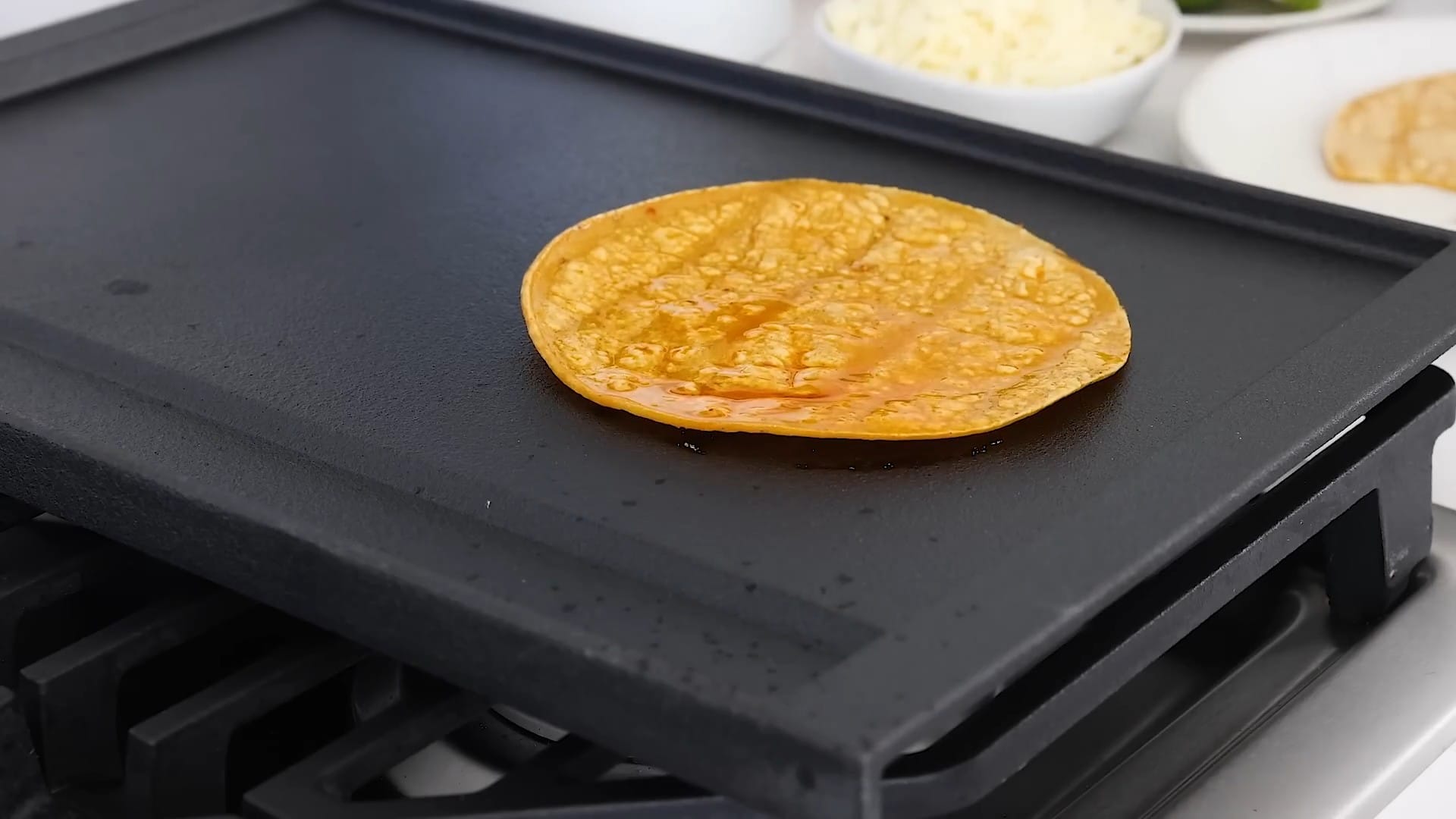 Cook the tortillas on a hot griddle or pan until lightly crispy.