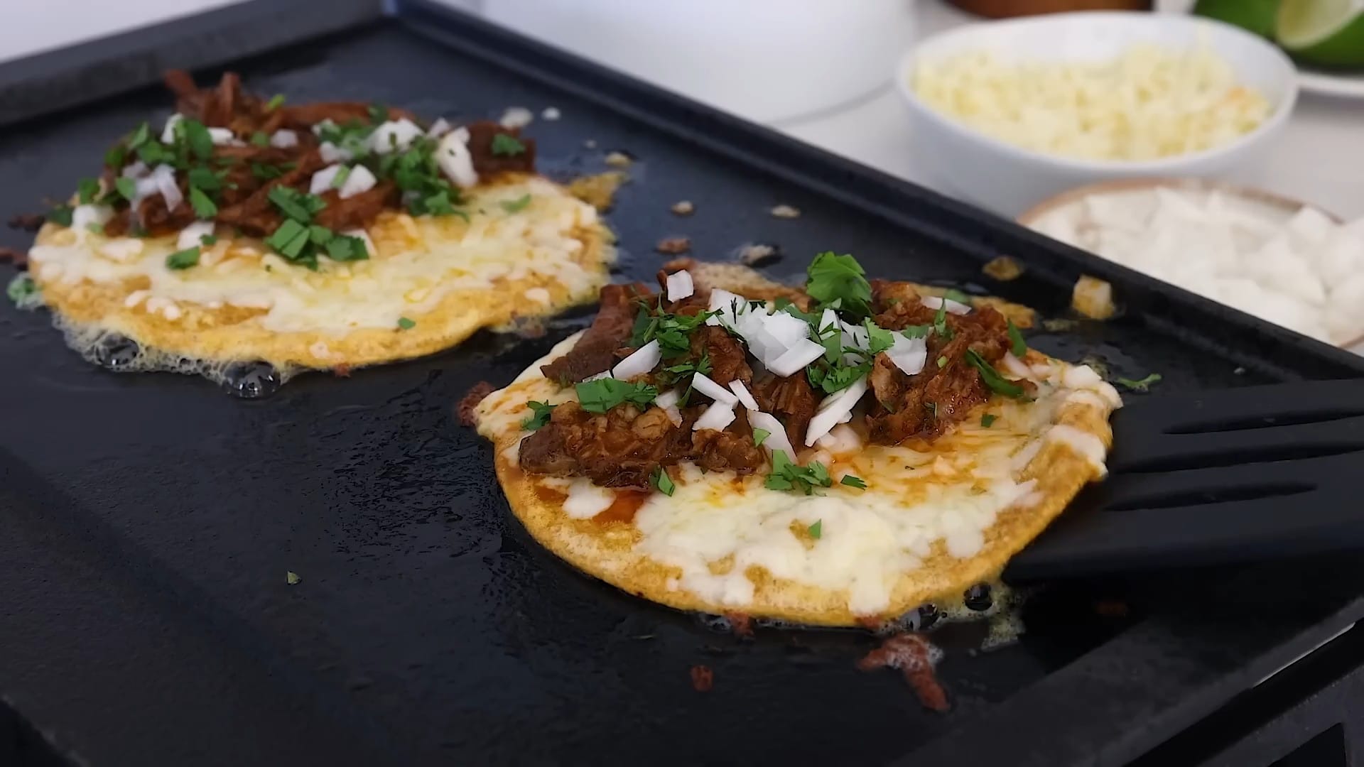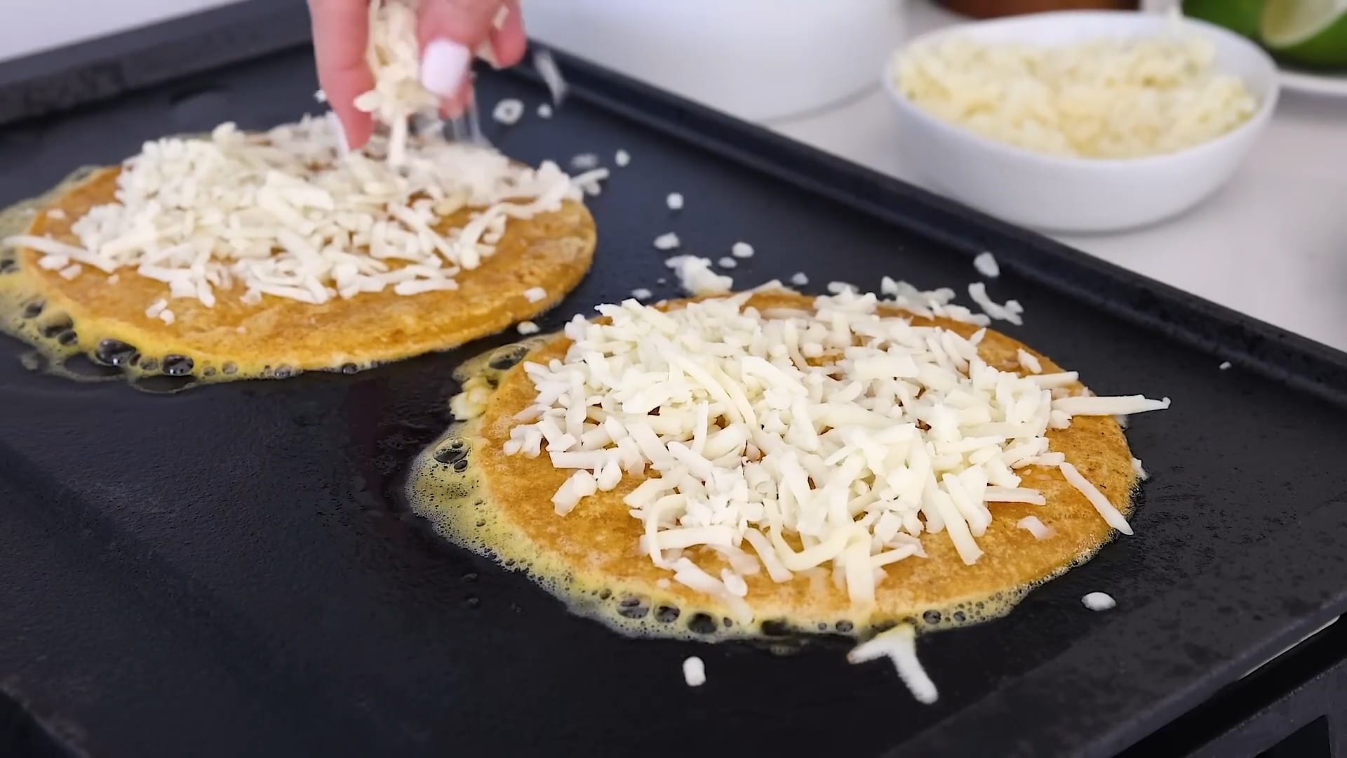 Flip the tortillas and sprinkle with Oaxaca cheese.
