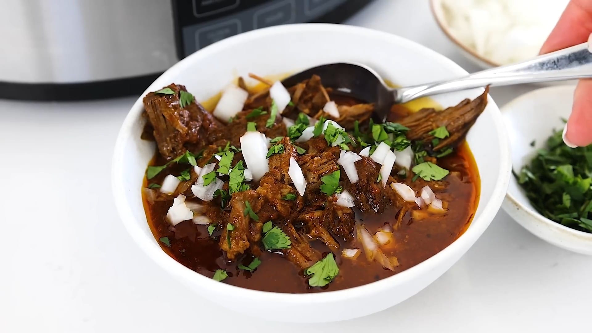 Serve the birria as a stew in bowls, garnished with chopped onion and cilantro.