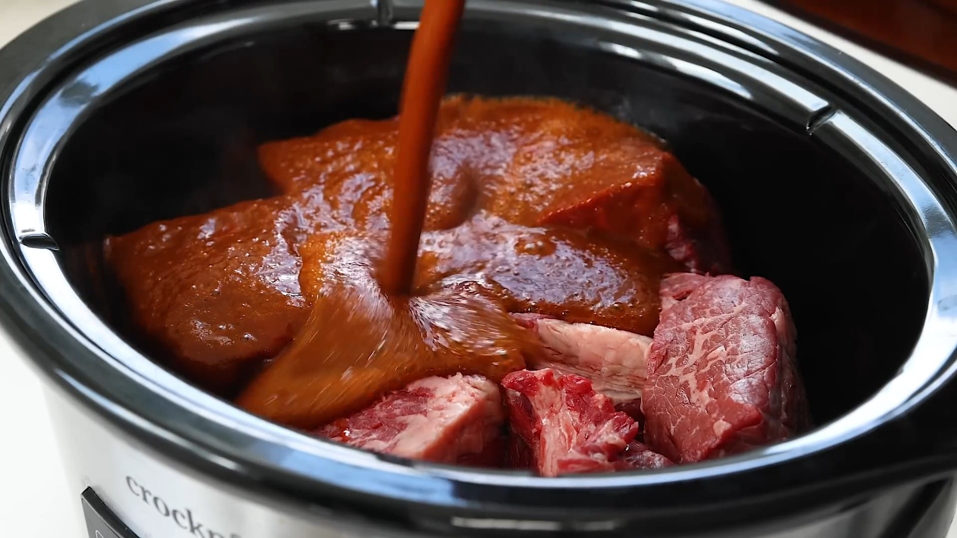 Pour the birria sauce over the beef in the slow cooker.