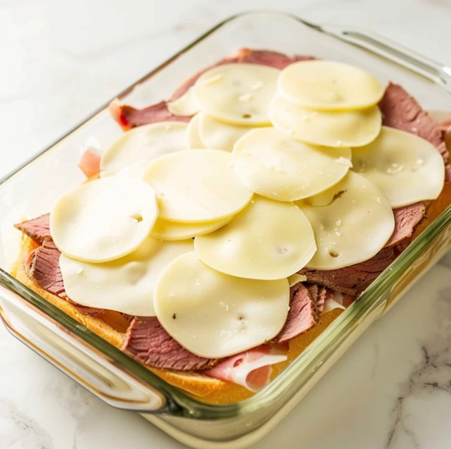 Slice your Hawaiian rolls in half, keeping them connected. Put the bottom half in the baking dish. Spread mayo on the cut sides and add mustard if you like.