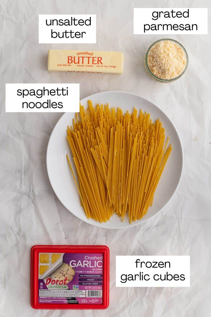 This garlic butter pasta recipe uses just four simple ingredients. You’ll need butter, frozen garlic, pasta, and Parmesan cheese. Let’s look at each one and some possible swaps.