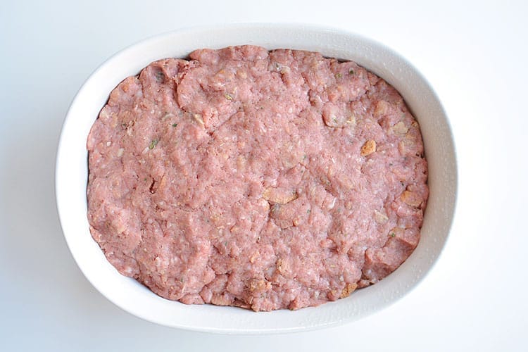 Press the meat mix into a greased baking dish or two loaf pans. Make sure it’s even.