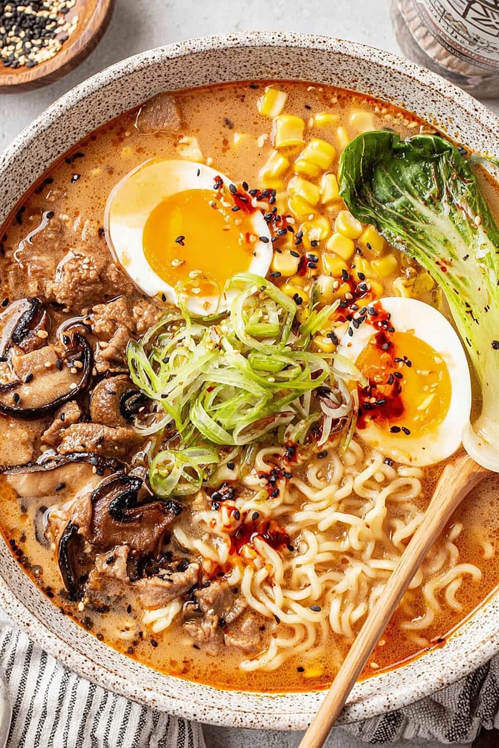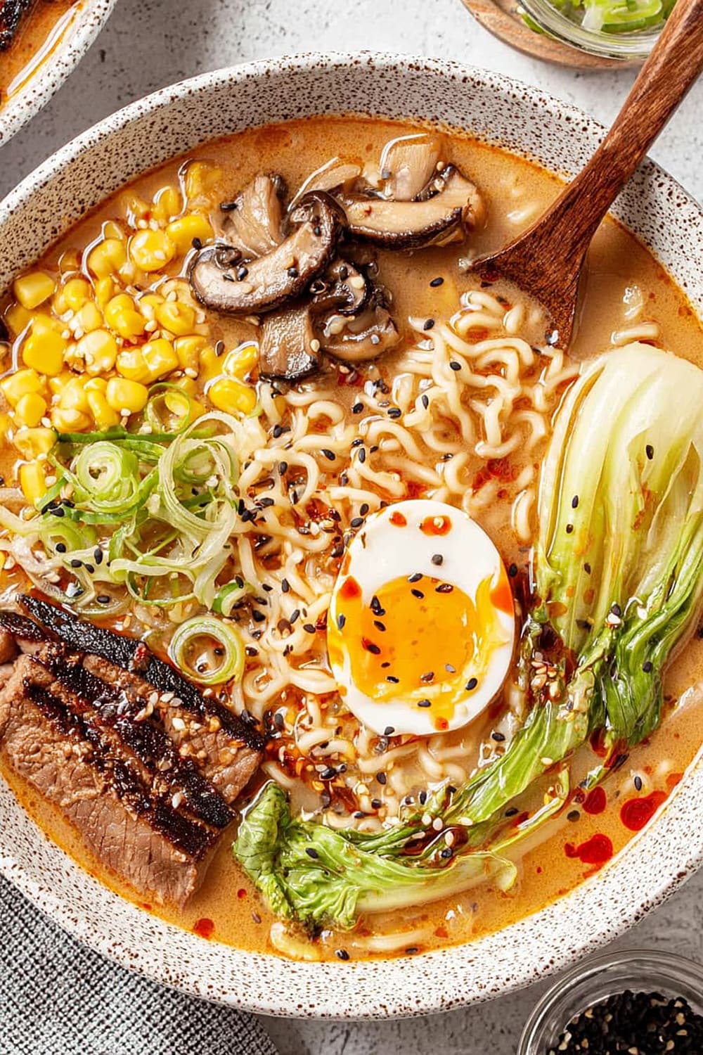 This hearty ramen is perfect for cold weather comfort food, especially during fall and winter months when the warming spices and rich broth provide satisfying nourishment. Serve for casual dinner parties where the interactive nature of customizing toppings creates a fun, social dining experience.