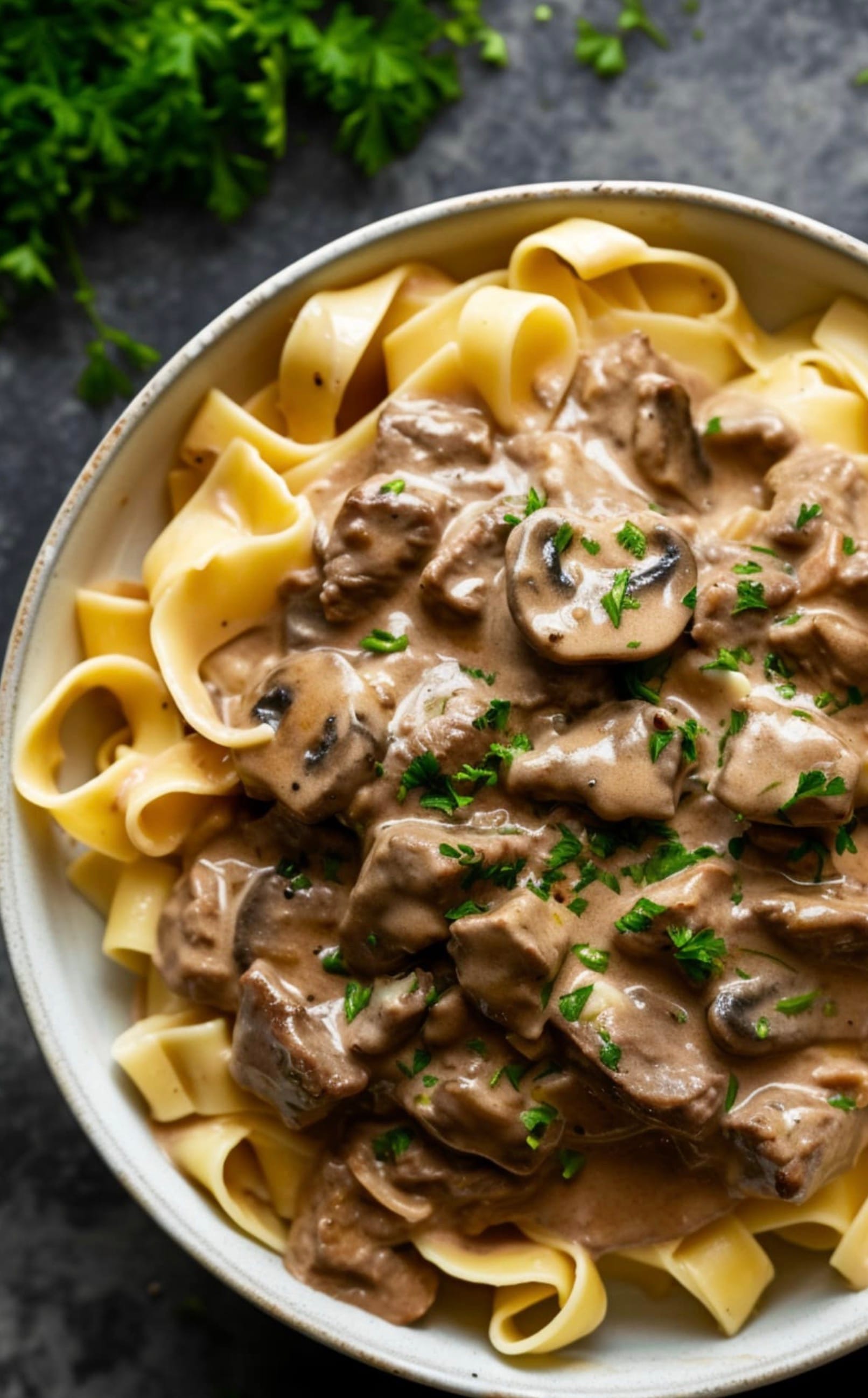 Serve your delicious beef stroganoff over cooked egg noodles or rice. Sprinkle some fresh parsley on top for a pop of color and extra flavor.