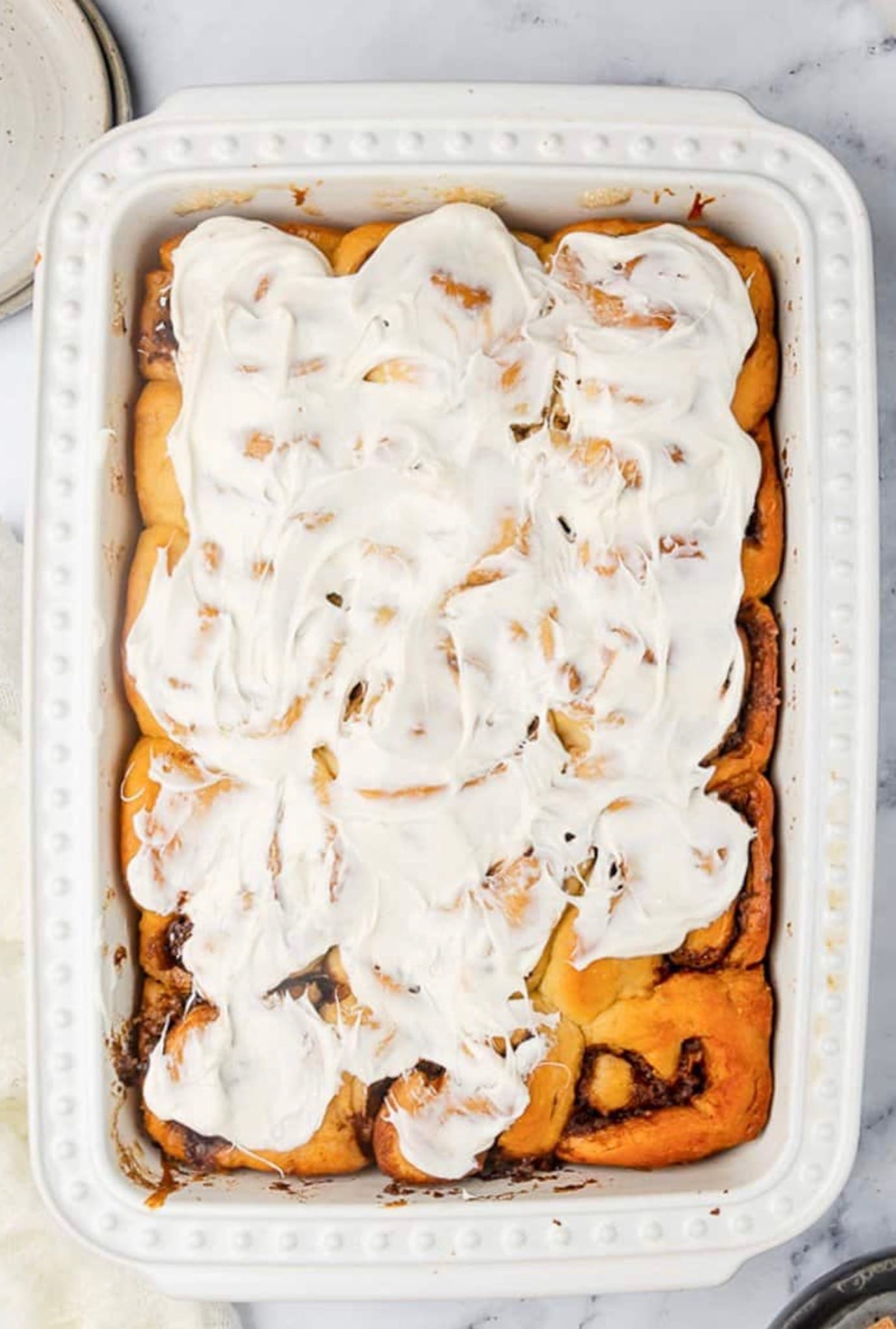 - Spread the frosting on top of the cinnamon rolls. If they are warm, the frosting may melt a little.