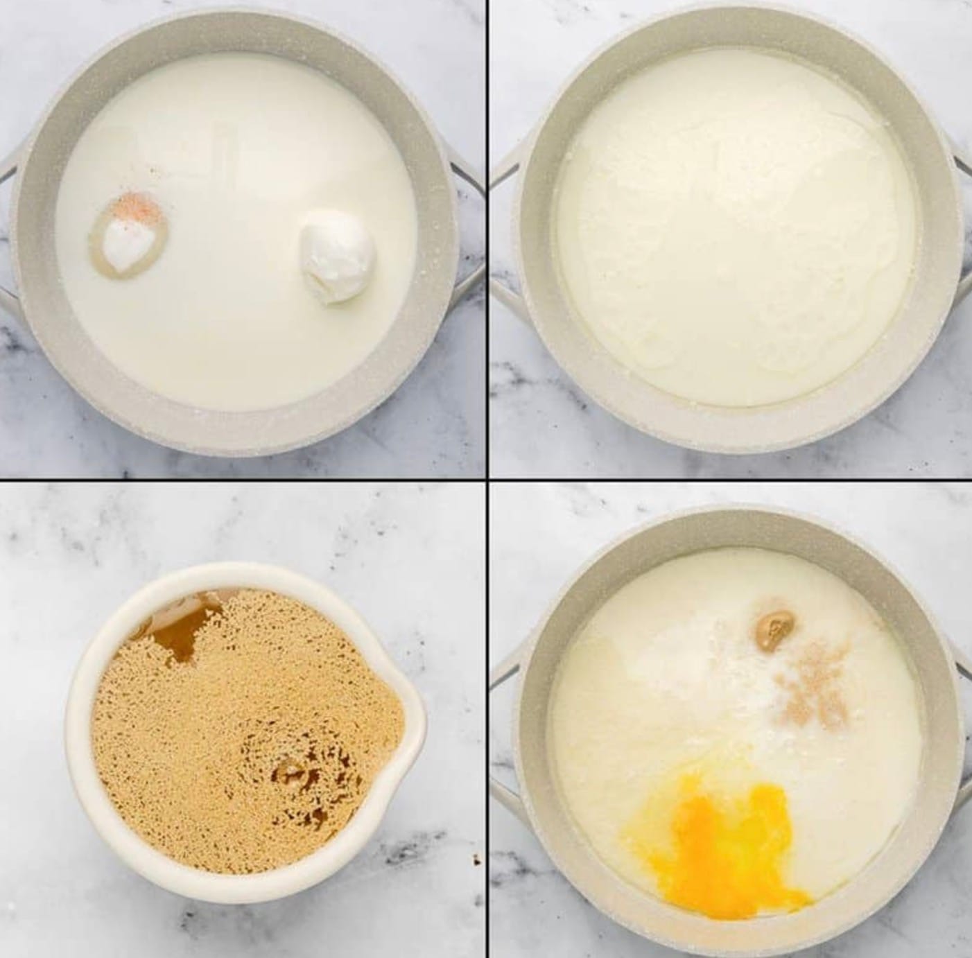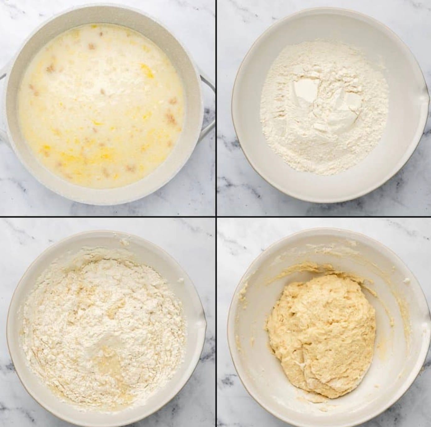 Mix these together to create your dough. The milk, sugar, shortening, and salt get heated first. Then you’ll add the yeast (mixed with warm water) and the egg. Finally, mix in the flour to make your dough.