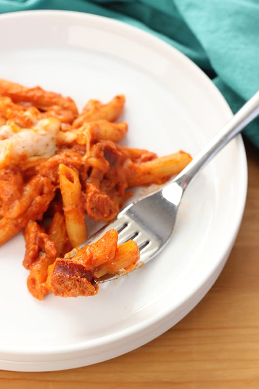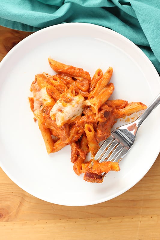 You can easily swap ingredients in this pasta bake to fit your tastes or what’s in your pantry. Try penne or fusilli instead of rigatoni. These shapes hold sauce well too.