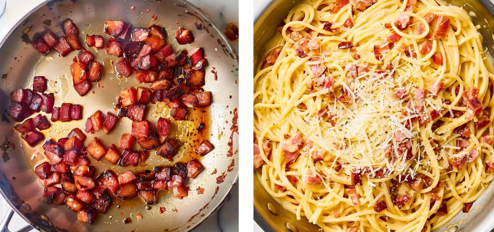 You’ll love how easy this pasta carbonara is to make! Start by boiling a big pot of salted water. Add the spaghetti and cook it for 8-10 minutes until it’s al dente. Don’t forget to save a cup of pasta water before draining!
