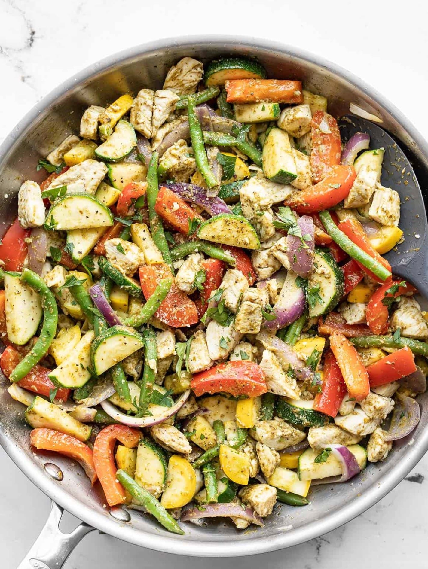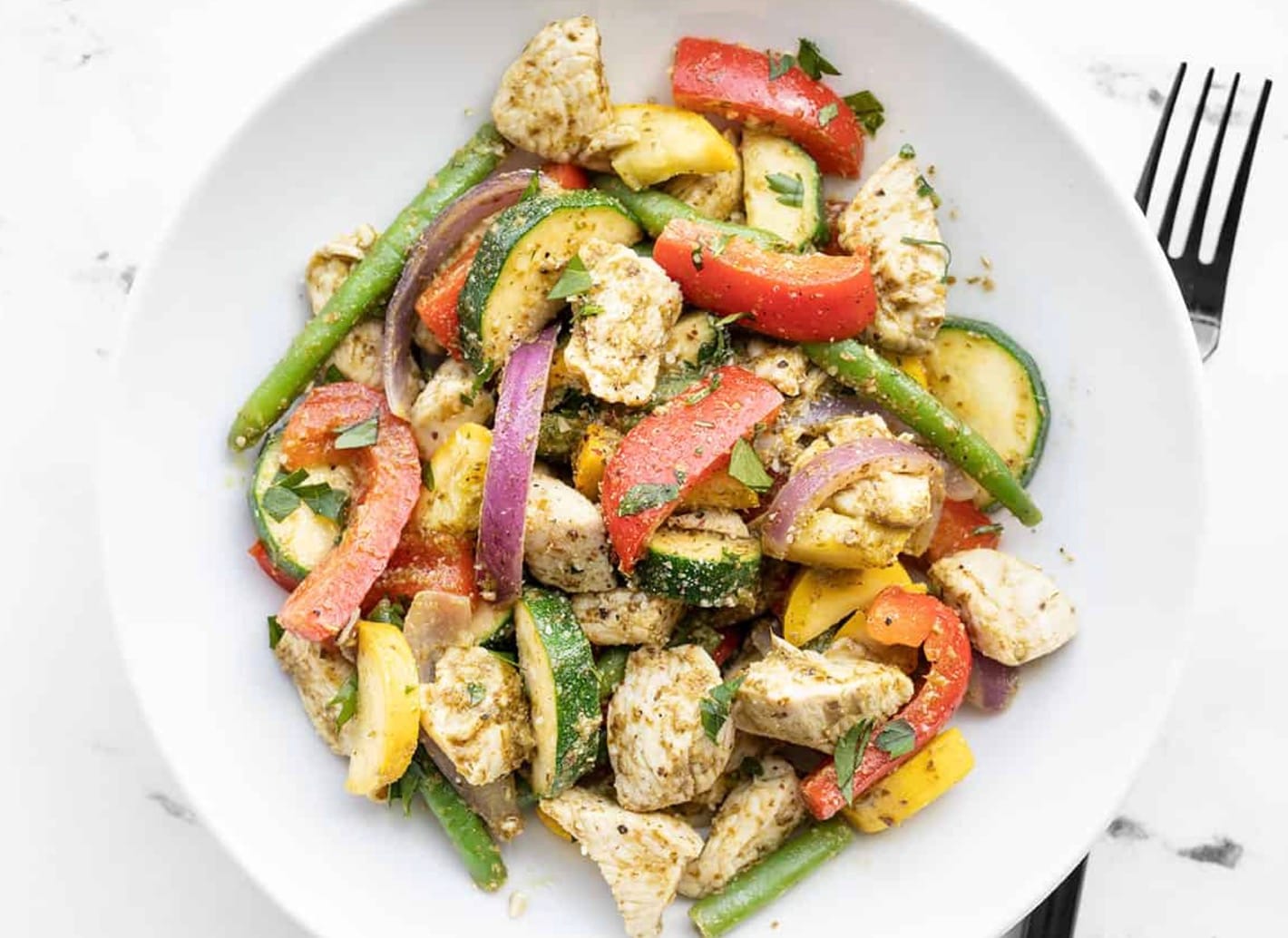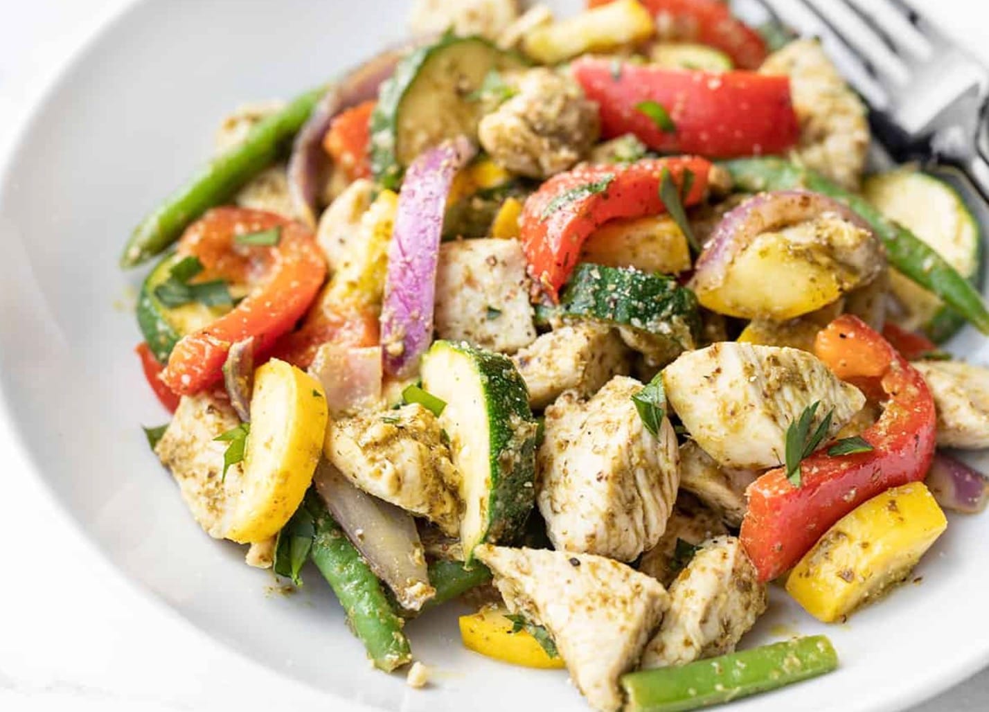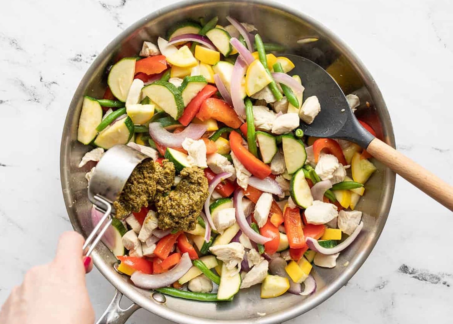 The recipe combines juicy chicken breast with colorful veggies like bell peppers, zucchini, and green beans. The star of the show is the pesto sauce, which adds a burst of flavor to every bite. Plus, it’s all cooked in one pan, so cleanup is a breeze!