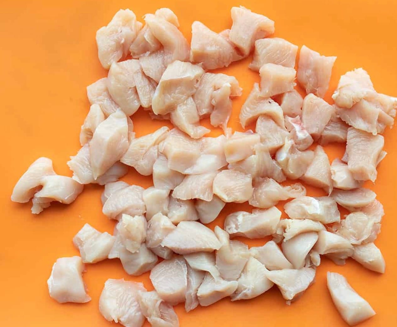 Chop the veggies into bite-sized pieces. Cut the chicken into small cubes.
