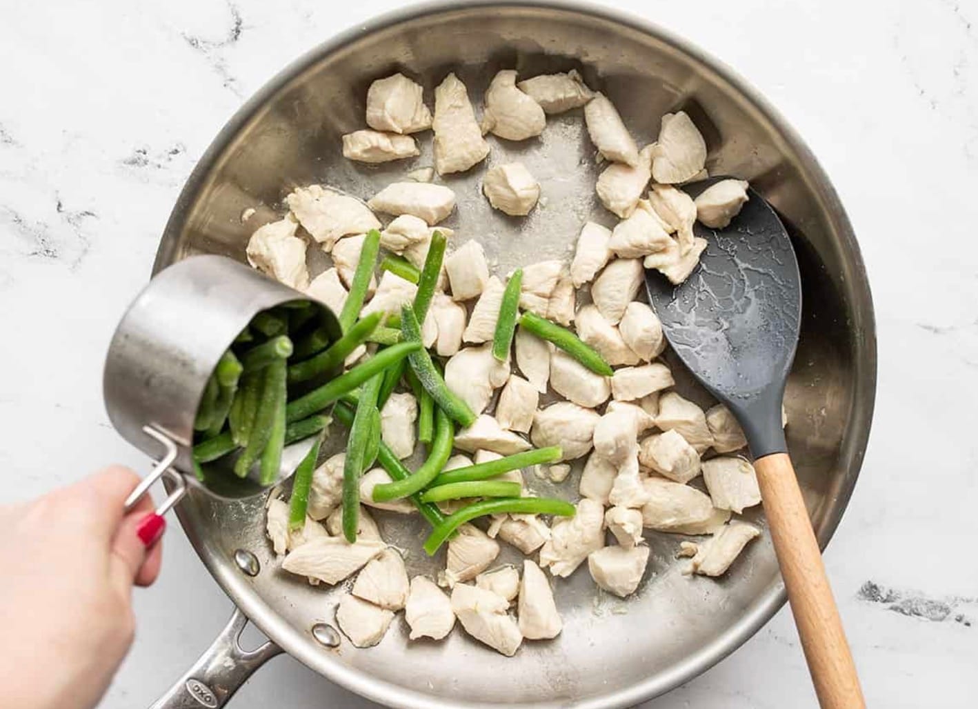 Toss in the frozen green beans. Cook for 1-2 minutes to thaw them out.