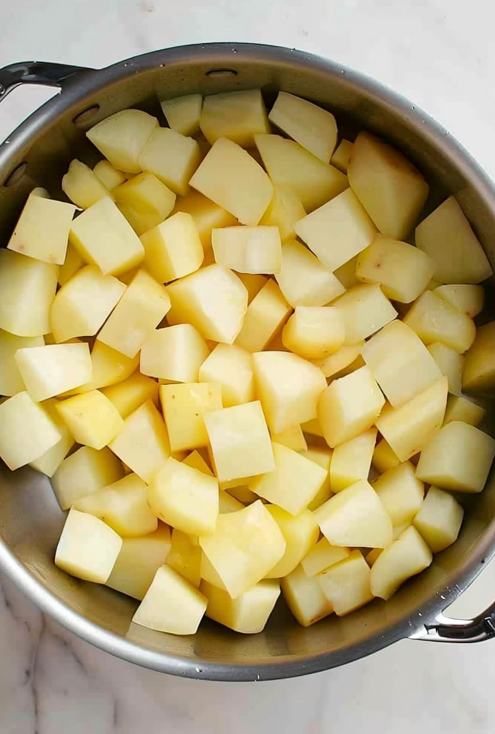 Put the potato cubes in a big pot. Cover them with cold water. Bring the water to a boil on high heat. Turn the heat down and let the potatoes simmer for 10-12 minutes. They should be soft but not mushy. Drain the water and let them cool a bit.