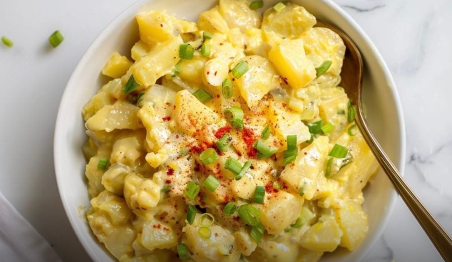 You can whip up this classic potato salad with basic ingredients you probably have in your kitchen. The trick is to cook the potatoes until they’re just right – soft but not mushy. After mixing everything together, be sure to chill the salad for a couple hours. This lets all the flavors come together for the best taste.