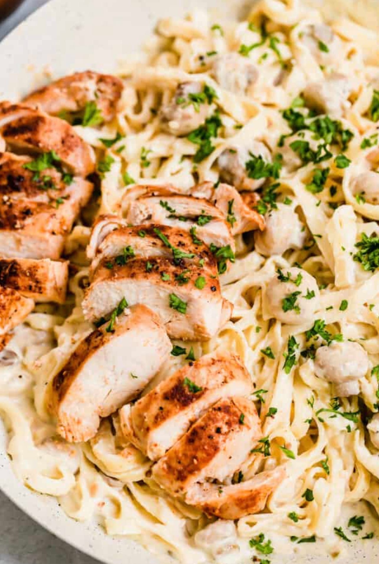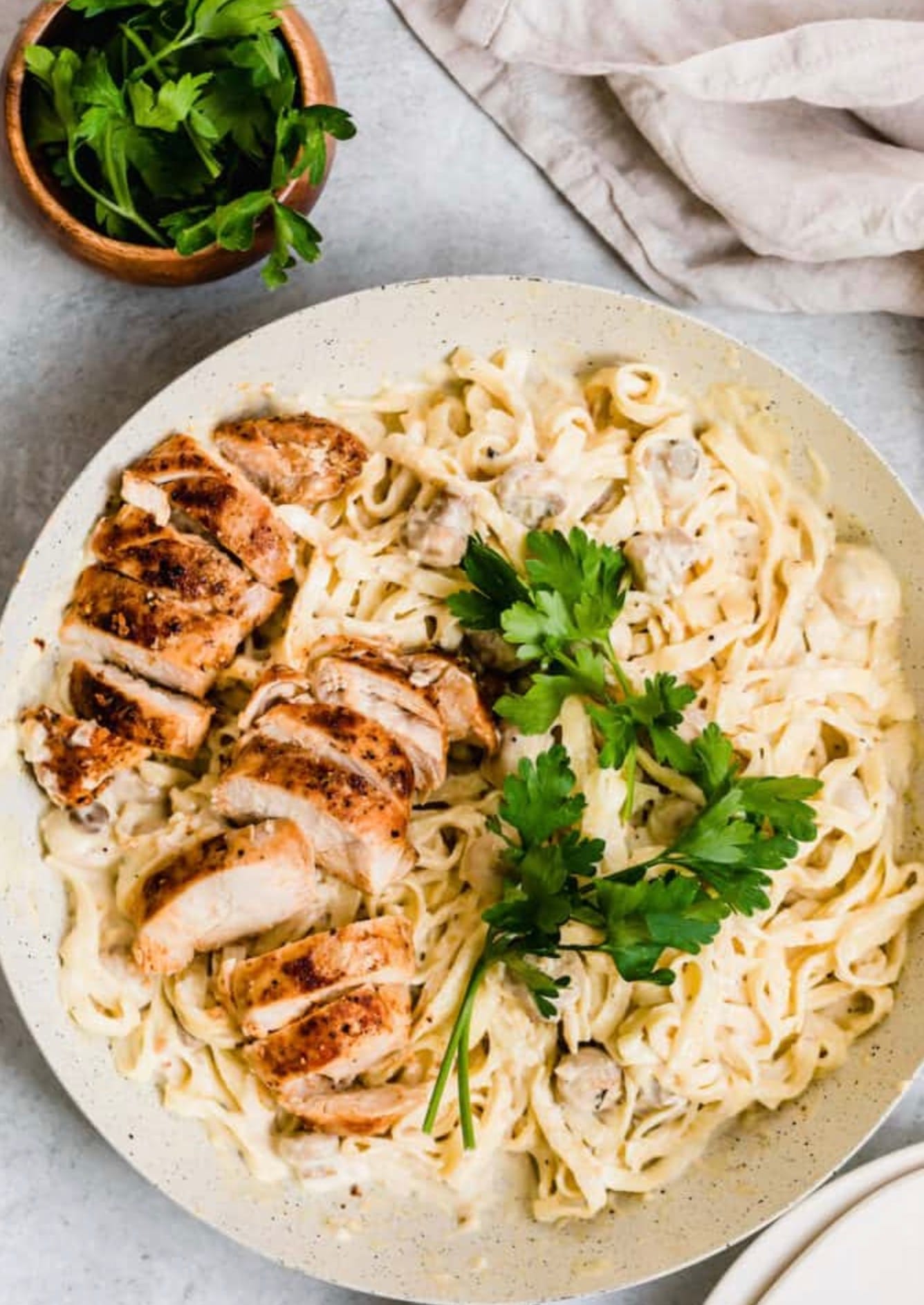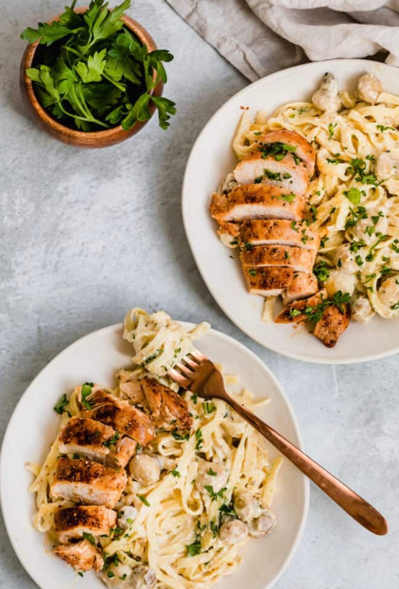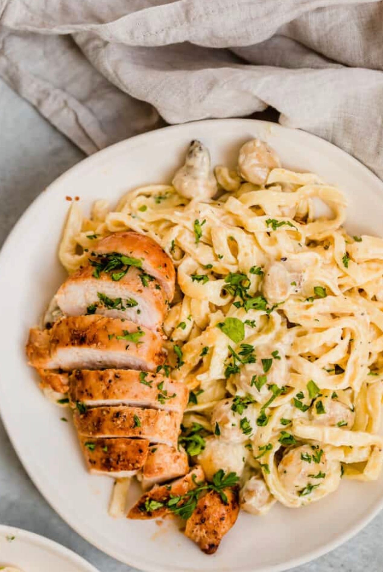 The recipe uses simple ingredients you might already have at home. Fettuccine noodles are coated in a rich sauce made with heavy cream, Parmesan cheese, and garlic. Tender chicken and mushrooms add protein and extra flavor. A sprinkle of parsley on top gives a fresh touch to this comforting classic.
