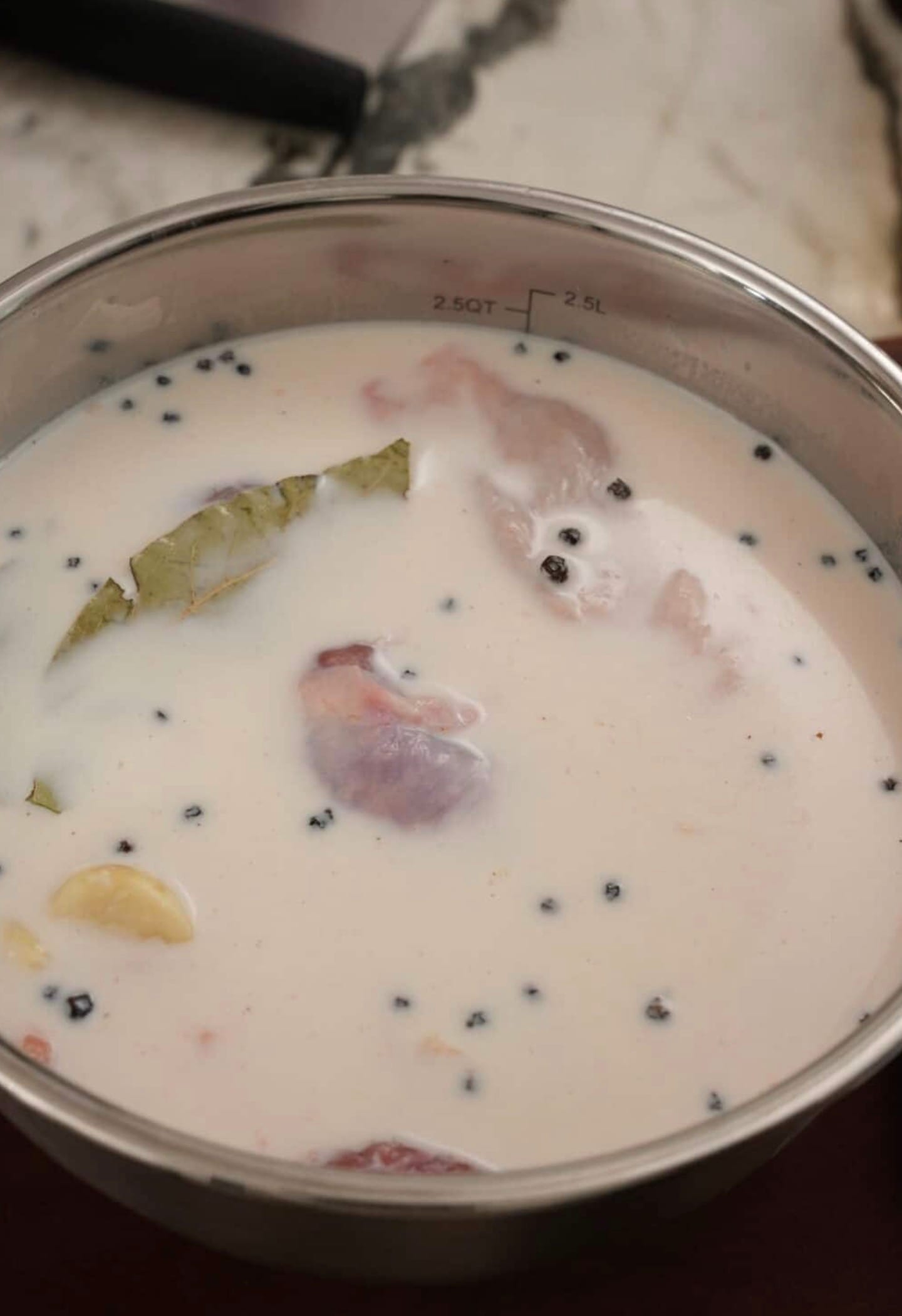 Start by poking small holes in the chicken with a knife. This helps the brine soak in better. Mix the brine with milk, salt, garlic, peppercorns, and bay leaves. Let the chicken sit in this mix for 2-3 hours or overnight.
