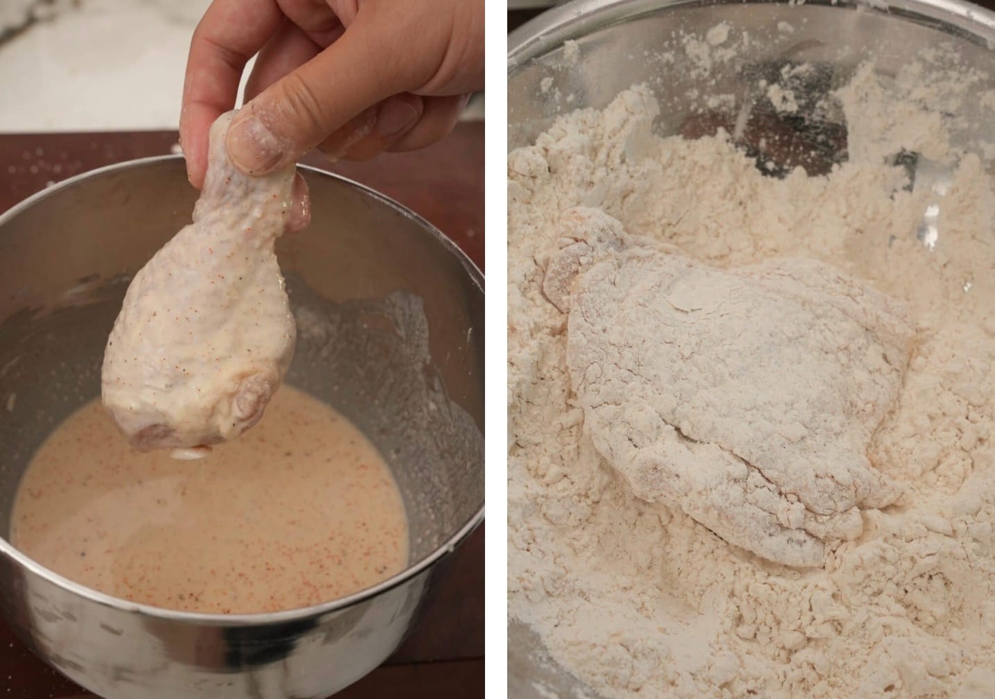 You’ll start by brining the chicken in a flavorful mix of milk, garlic, and spices. This helps lock in moisture and adds tons of taste. Then you’ll coat each piece in a seasoned flour mixture before dipping it in a wet batter.